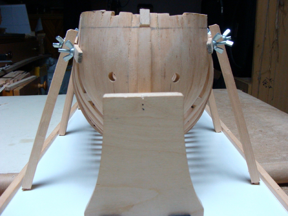 Witam ponownie.Przez kilka dni aura sprzyjała pracy w stoczni więc nieco podciągnąłem z robotą.Po wklejeniu wręg,całość szkieletu usztywniona w sposób pokazany na zdjęciach.Teraz można przystąpić do prac wewnątrz.Przede wszystkim wyrównanie wręg a następnie dalsze prace.Pozdrawiam.Kazimierz.