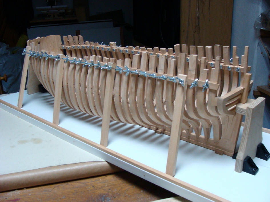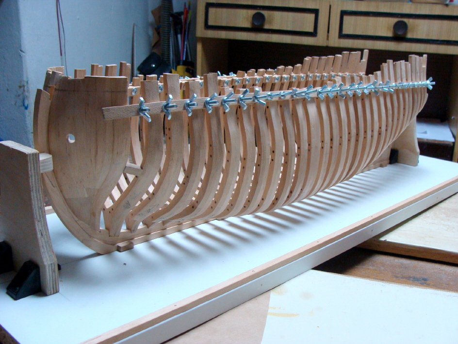 Następna porcja fotek.Kadłub powoli się wypełnia.W następnym etapie,po unieruchomieniu,wręgi będą docierane wewnątrz i na zewnątrz.Idealne spasowanie na obecnym etapie prawie niemożliwe.Przynajmniej dla mnie.Pozdrawiam.Kazimierz.
