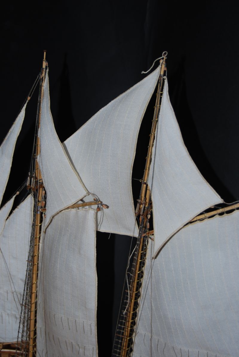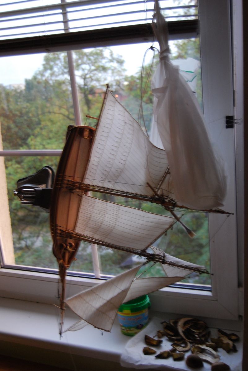 Tak stał i stał aż stwierdziłem że z prostymi żaglami to jest nudny jak flaki z olejem. Postanowiłem metodą lakieru damskiego do włosów sztywności D( ponoć najmocniejszy go ożywić ). Oczywiście przeciwko był na przykład czynnik że materiał na żagle nie był wcześniej sprany i teraz kurczą się żagle o 15 procent w stosunku do wymiaru jaki jest przed moczeniem. Trzeba pamiętać że żagle już są na okręcie za wyjątkiem jednego, co czyni operację tym bardziej upierdliwą. Ale co tam. Zaczynam od gafla. Pierwsze nałożenie i widać że żagiel przesiąka. Układam okręt płasko na parapecie a do sznurków żaluzji mam przymocowany podwójny worek z wodą. Sprawdziłem iż wcześniej nie ciekł. Został tak zawieszony nad żaglem aby był tylko nacisk wody. Z uwagi na dużą pojemność położenie worka swobodnie powodowało niekontrolowane jego ułożenie, stąd potrzebne podwieszenie. I tak pozostawiłem do samoistnego wyschnięcia. Powstały plamy w wyniku kurzu oraz przecieku wody. Niby małe kropelki ale z lakierem jakoś tak dziwnie przereagowały że w tym miejscu żagiel uzyskał jakby przezroczystość. Za dużo nałożyłem lakieru jednorazowo to inna sprawa a i sam żagiel po 26 latach leżakowania w różnych warunkach widocznie był równomiernie zakurzony. Balon z wodą się nie spisał a z piaskiem nie próbowałem. No to spieranie żagla na okręcie !!! Masakra. Jakoś się udało żeby był biały. Skomplikowanym systemem blokowania mokrego żagla udało się nie dopuścić do skurczenia. Po 2 dniach walki 3 dnia udało się uzyskać wypukłość na gaflu i opanować lakier do tego stopnia aby uniknąć plam i uzyskać właściwą sztywność. Wymagana sztywność została uzyskana po 3 - 4 naniesieniach. Oczywiście suszarka i to mocna też okazała się bardzo pomocna. Tydzień czasu robiłem podejścia jak koło jeża do okrętu. Zdjęcia z lampą błyskową pokazują załamania na żaglach które w rzeczywistości są niewidoczne. Do zrobienia pozostała reszta linek która układa żagle we właściwy sposób. Na zdjęciach pokazany tylko efekt dmuchania żagli.