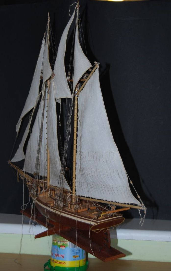 Tak stał i stał aż stwierdziłem że z prostymi żaglami to jest nudny jak flaki z olejem. Postanowiłem metodą lakieru damskiego do włosów sztywności D( ponoć najmocniejszy go ożywić ). Oczywiście przeciwko był na przykład czynnik że materiał na żagle nie był wcześniej sprany i teraz kurczą się żagle o 15 procent w stosunku do wymiaru jaki jest przed moczeniem. Trzeba pamiętać że żagle już są na okręcie za wyjątkiem jednego, co czyni operację tym bardziej upierdliwą. Ale co tam. Zaczynam od gafla. Pierwsze nałożenie i widać że żagiel przesiąka. Układam okręt płasko na parapecie a do sznurków żaluzji mam przymocowany podwójny worek z wodą. Sprawdziłem iż wcześniej nie ciekł. Został tak zawieszony nad żaglem aby był tylko nacisk wody. Z uwagi na dużą pojemność położenie worka swobodnie powodowało niekontrolowane jego ułożenie, stąd potrzebne podwieszenie. I tak pozostawiłem do samoistnego wyschnięcia. Powstały plamy w wyniku kurzu oraz przecieku wody. Niby małe kropelki ale z lakierem jakoś tak dziwnie przereagowały że w tym miejscu żagiel uzyskał jakby przezroczystość. Za dużo nałożyłem lakieru jednorazowo to inna sprawa a i sam żagiel po 26 latach leżakowania w różnych warunkach widocznie był równomiernie zakurzony. Balon z wodą się nie spisał a z piaskiem nie próbowałem. No to spieranie żagla na okręcie !!! Masakra. Jakoś się udało żeby był biały. Skomplikowanym systemem blokowania mokrego żagla udało się nie dopuścić do skurczenia. Po 2 dniach walki 3 dnia udało się uzyskać wypukłość na gaflu i opanować lakier do tego stopnia aby uniknąć plam i uzyskać właściwą sztywność. Wymagana sztywność została uzyskana po 3 - 4 naniesieniach. Oczywiście suszarka i to mocna też okazała się bardzo pomocna. Tydzień czasu robiłem podejścia jak koło jeża do okrętu. Zdjęcia z lampą błyskową pokazują załamania na żaglach które w rzeczywistości są niewidoczne. Do zrobienia pozostała reszta linek która układa żagle we właściwy sposób. Na zdjęciach pokazany tylko efekt dmuchania żagli.