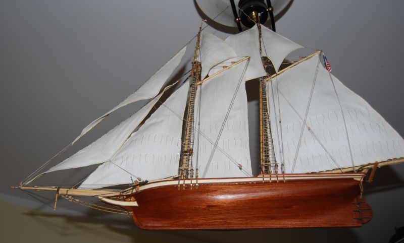 Tak stał i stał aż stwierdziłem że z prostymi żaglami to jest nudny jak flaki z olejem. Postanowiłem metodą lakieru damskiego do włosów sztywności D( ponoć najmocniejszy go ożywić ). Oczywiście przeciwko był na przykład czynnik że materiał na żagle nie był wcześniej sprany i teraz kurczą się żagle o 15 procent w stosunku do wymiaru jaki jest przed moczeniem. Trzeba pamiętać że żagle już są na okręcie za wyjątkiem jednego, co czyni operację tym bardziej upierdliwą. Ale co tam. Zaczynam od gafla. Pierwsze nałożenie i widać że żagiel przesiąka. Układam okręt płasko na parapecie a do sznurków żaluzji mam przymocowany podwójny worek z wodą. Sprawdziłem iż wcześniej nie ciekł. Został tak zawieszony nad żaglem aby był tylko nacisk wody. Z uwagi na dużą pojemność położenie worka swobodnie powodowało niekontrolowane jego ułożenie, stąd potrzebne podwieszenie. I tak pozostawiłem do samoistnego wyschnięcia. Powstały plamy w wyniku kurzu oraz przecieku wody. Niby małe kropelki ale z lakierem jakoś tak dziwnie przereagowały że w tym miejscu żagiel uzyskał jakby przezroczystość. Za dużo nałożyłem lakieru jednorazowo to inna sprawa a i sam żagiel po 26 latach leżakowania w różnych warunkach widocznie był równomiernie zakurzony. Balon z wodą się nie spisał a z piaskiem nie próbowałem. No to spieranie żagla na okręcie !!! Masakra. Jakoś się udało żeby był biały. Skomplikowanym systemem blokowania mokrego żagla udało się nie dopuścić do skurczenia. Po 2 dniach walki 3 dnia udało się uzyskać wypukłość na gaflu i opanować lakier do tego stopnia aby uniknąć plam i uzyskać właściwą sztywność. Wymagana sztywność została uzyskana po 3 - 4 naniesieniach. Oczywiście suszarka i to mocna też okazała się bardzo pomocna. Tydzień czasu robiłem podejścia jak koło jeża do okrętu. Zdjęcia z lampą błyskową pokazują załamania na żaglach które w rzeczywistości są niewidoczne. Do zrobienia pozostała reszta linek która układa żagle we właściwy sposób. Na zdjęciach pokazany tylko efekt dmuchania żagli.