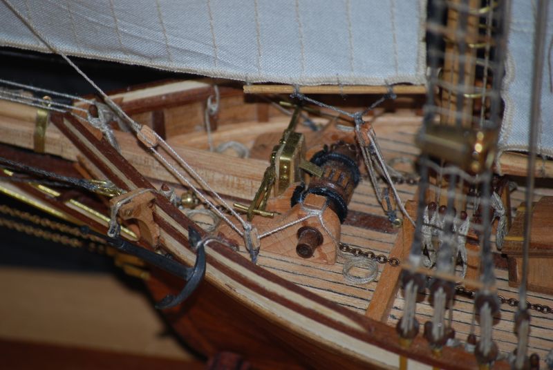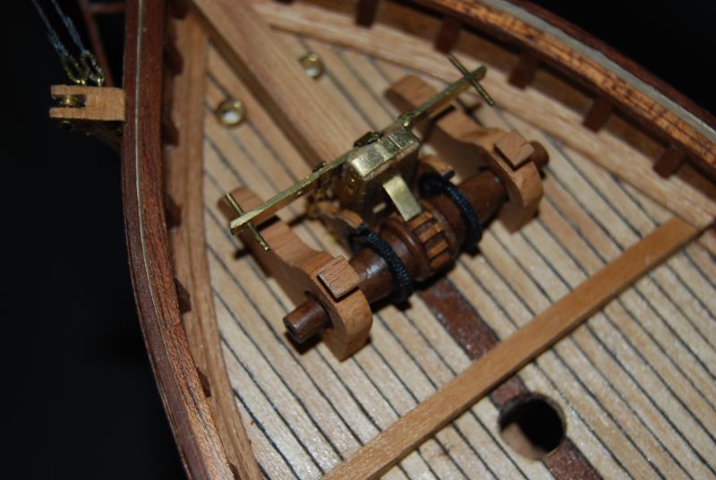Wymęczona winda. Wymęczona z braku narzędzi do obsługi metalurgii ale jakoś to wyszło. Podstawowa część do machania jest z zestawu. Reszty nie było. Sama machaczka miała wisieć w powietrzu i to jeszcze wbita od góry w jarzmo bukszprytu. Żałuje że jej nie wymieniłem ale z drugiej strony i tak nie miałbym jak polutować nowej. Biała zębatka czerniona farbą jest ze zużytej kocówki od cyjanopanu. Idealnie wręcz podpasowała. Zostawiam całość w kolorze mosiądzu jak i inne detale na jednostce również.