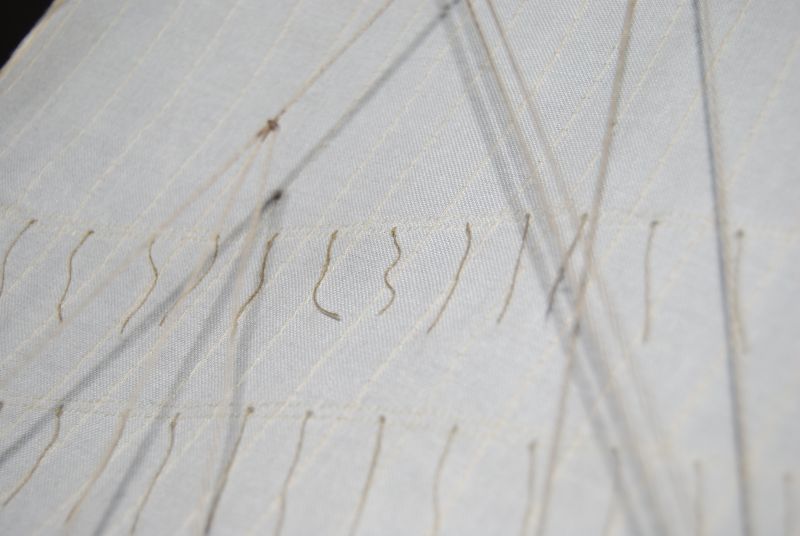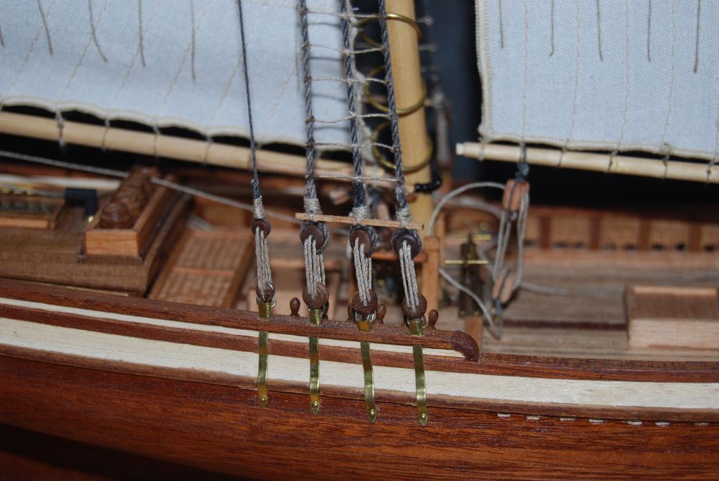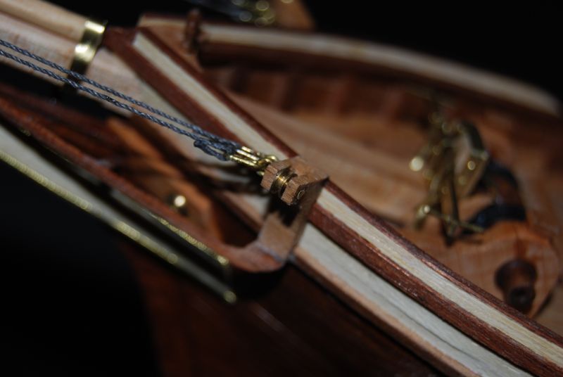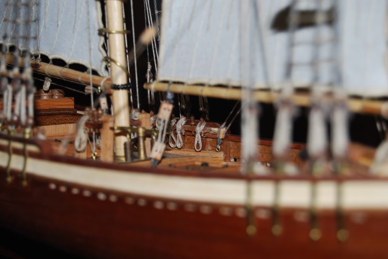 No i tak do węzełka model został ukończony. Nie bez perturbacji ( uczył się latać i tylna kolumna topowa ucierpiała a na dodatek imadło do stępki przytwierdzone było, zahaczyłem nogą odchodząc od biurka ostatnią wiązaną linę ). Nie wiem jak na Wasze oko ( oczy ) wygląda ta profilacja żagli bo na moje to się średnio udała. W szczególności fakt że żagle się pokurczyły. Co trochę widać. Uczulam zatem na spieranie materiału na żagle przed pracami.