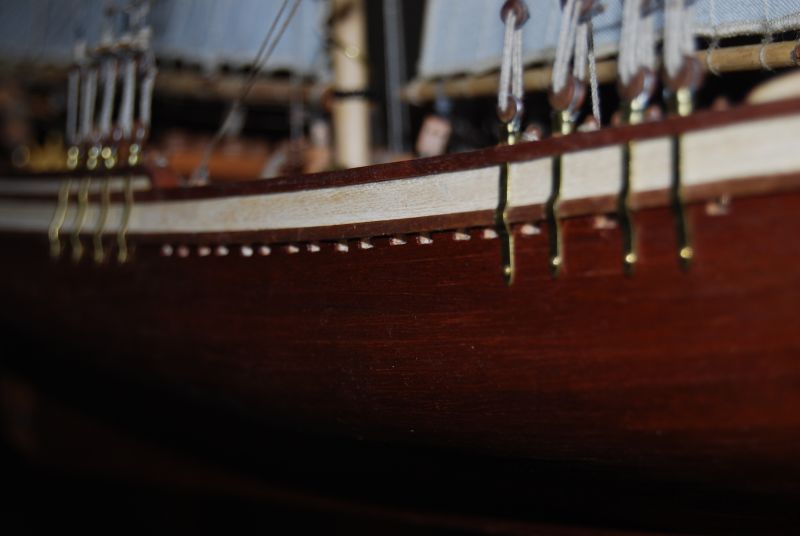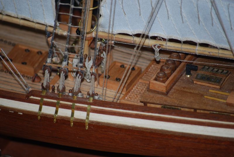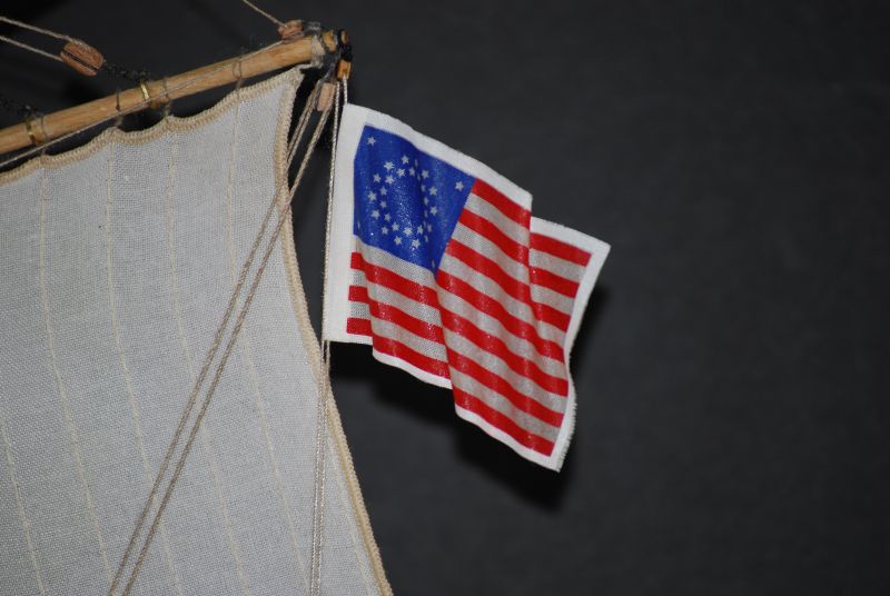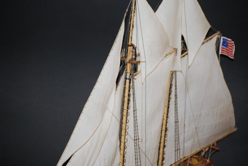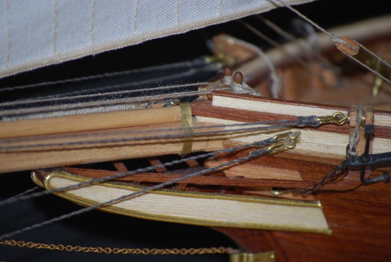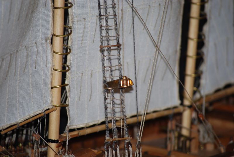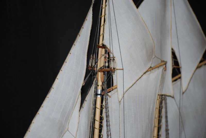 Tak stał i stał aż stwierdziłem że z prostymi żaglami to jest nudny jak flaki z olejem. Postanowiłem metodą lakieru damskiego do włosów sztywności D( ponoć najmocniejszy go ożywić ). Oczywiście przeciwko był na przykład czynnik że materiał na żagle nie był wcześniej sprany i teraz kurczą się żagle o 15 procent w stosunku do wymiaru jaki jest przed moczeniem. Trzeba pamiętać że żagle już są na okręcie za wyjątkiem jednego, co czyni operację tym bardziej upierdliwą. Ale co tam. Zaczynam od gafla. Pierwsze nałożenie i widać że żagiel przesiąka. Układam okręt płasko na parapecie a do sznurków żaluzji mam przymocowany podwójny worek z wodą. Sprawdziłem iż wcześniej nie ciekł. Został tak zawieszony nad żaglem aby był tylko nacisk wody. Z uwagi na dużą pojemność położenie worka swobodnie powodowało niekontrolowane jego ułożenie, stąd potrzebne podwieszenie. I tak pozostawiłem do samoistnego wyschnięcia. Powstały plamy w wyniku kurzu oraz przecieku wody. Niby małe kropelki ale z lakierem jakoś tak dziwnie przereagowały że w tym miejscu żagiel uzyskał jakby przezroczystość. Za dużo nałożyłem lakieru jednorazowo to inna sprawa a i sam żagiel po 26 latach leżakowania w różnych warunkach widocznie był równomiernie zakurzony. Balon z wodą się nie spisał a z piaskiem nie próbowałem. No to spieranie żagla na okręcie !!! Masakra. Jakoś się udało żeby był biały. Skomplikowanym systemem blokowania mokrego żagla udało się nie dopuścić do skurczenia. Po 2 dniach walki 3 dnia udało się uzyskać wypukłość na gaflu i opanować lakier do tego stopnia aby uniknąć plam i uzyskać właściwą sztywność. Wymagana sztywność została uzyskana po 3 - 4 naniesieniach. Oczywiście suszarka i to mocna też okazała się bardzo pomocna. Tydzień czasu robiłem podejścia jak koło jeża do okrętu. Zdjęcia z lampą błyskową pokazują załamania na żaglach które w rzeczywistości są niewidoczne. Do zrobienia pozostała reszta linek która układa żagle we właściwy sposób. Na zdjęciach pokazany tylko efekt dmuchania żagli.