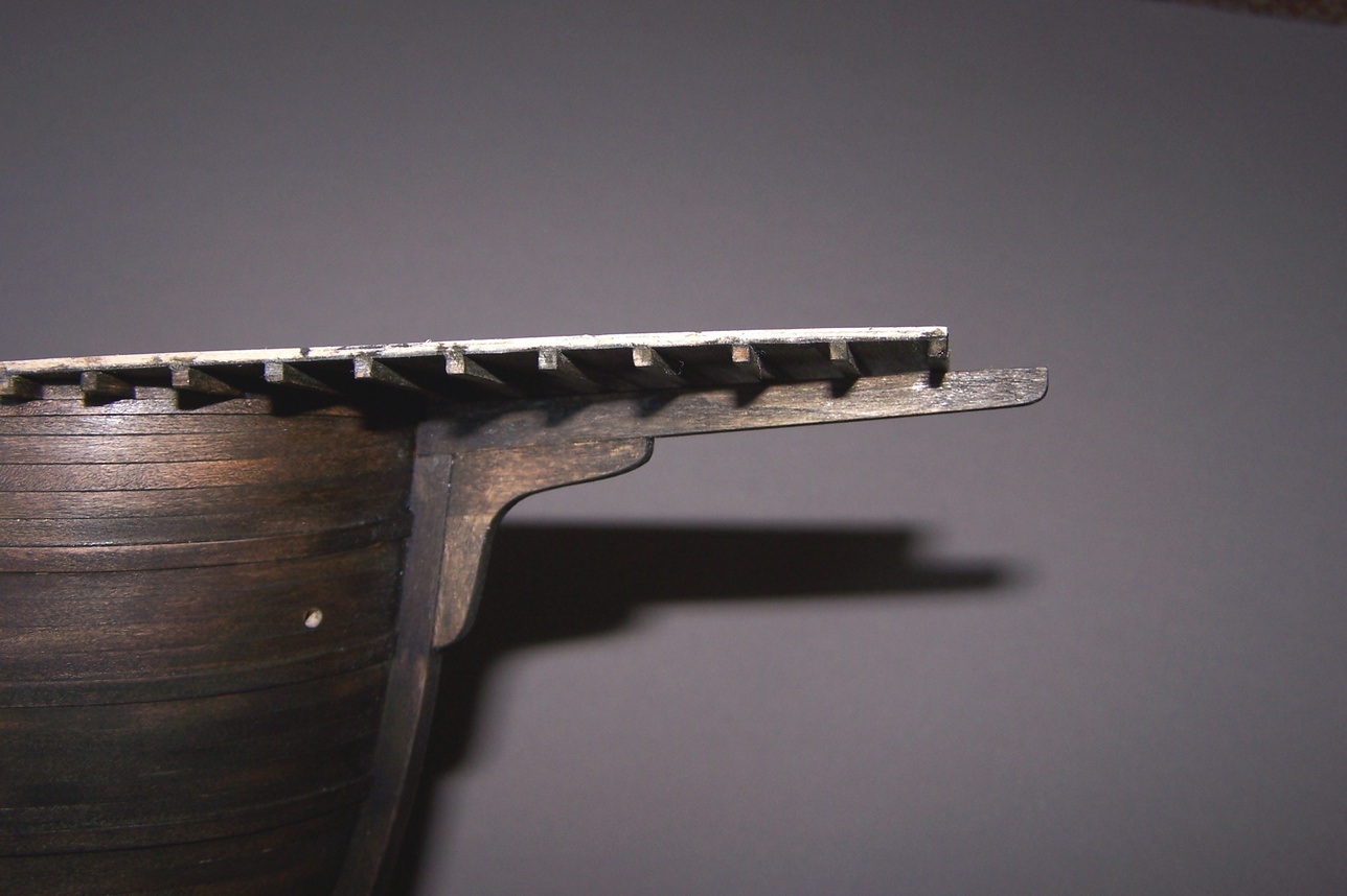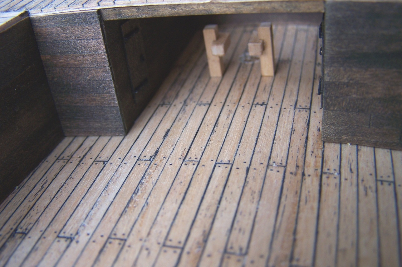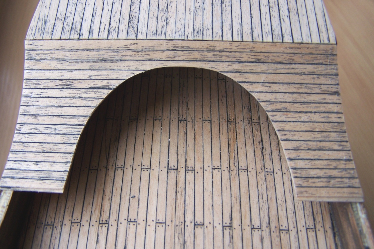 Cześć.Ostatnio miałem więcej obowiązków na głowie to prace trochę zwolniły.Przybyły pomosty wzdłuż burt.I tu zasadnicza różnica między moim modelem a tym z CMM.Model z muzeum ma zabudowane pomieszczenia wzdłóż całej burty.Takie niby tunele