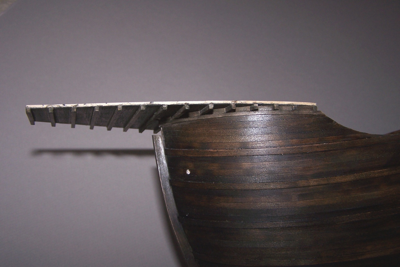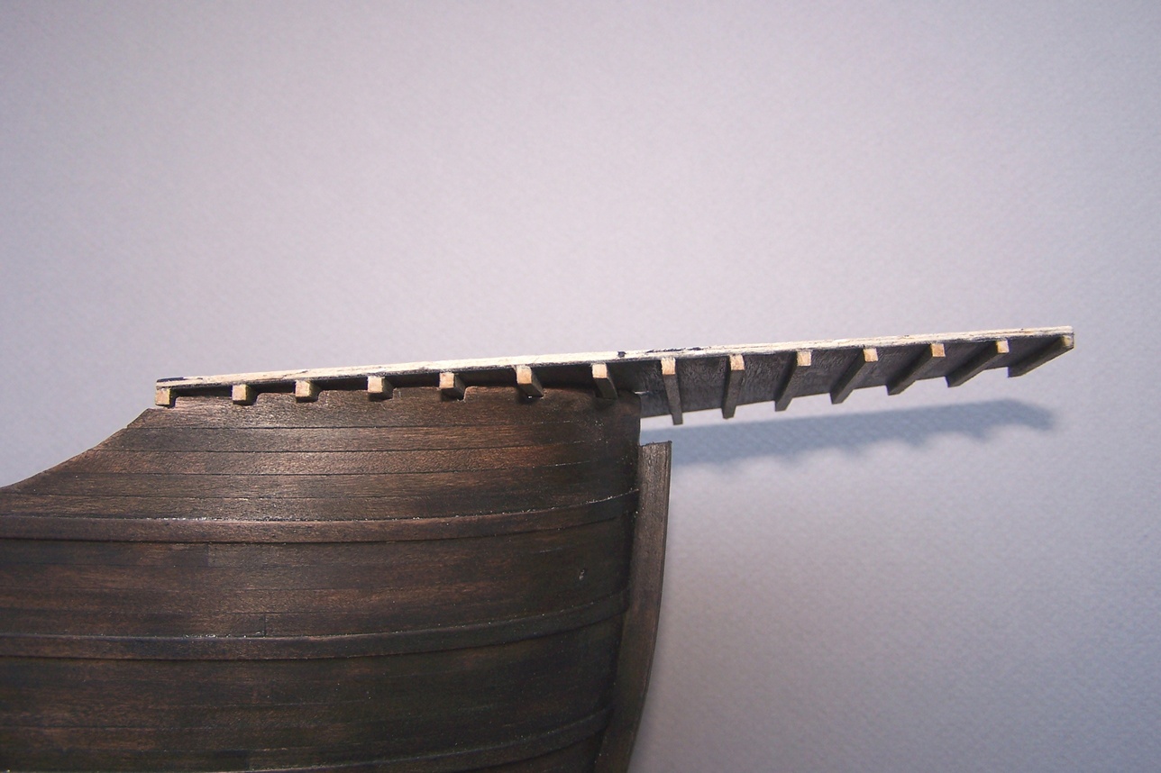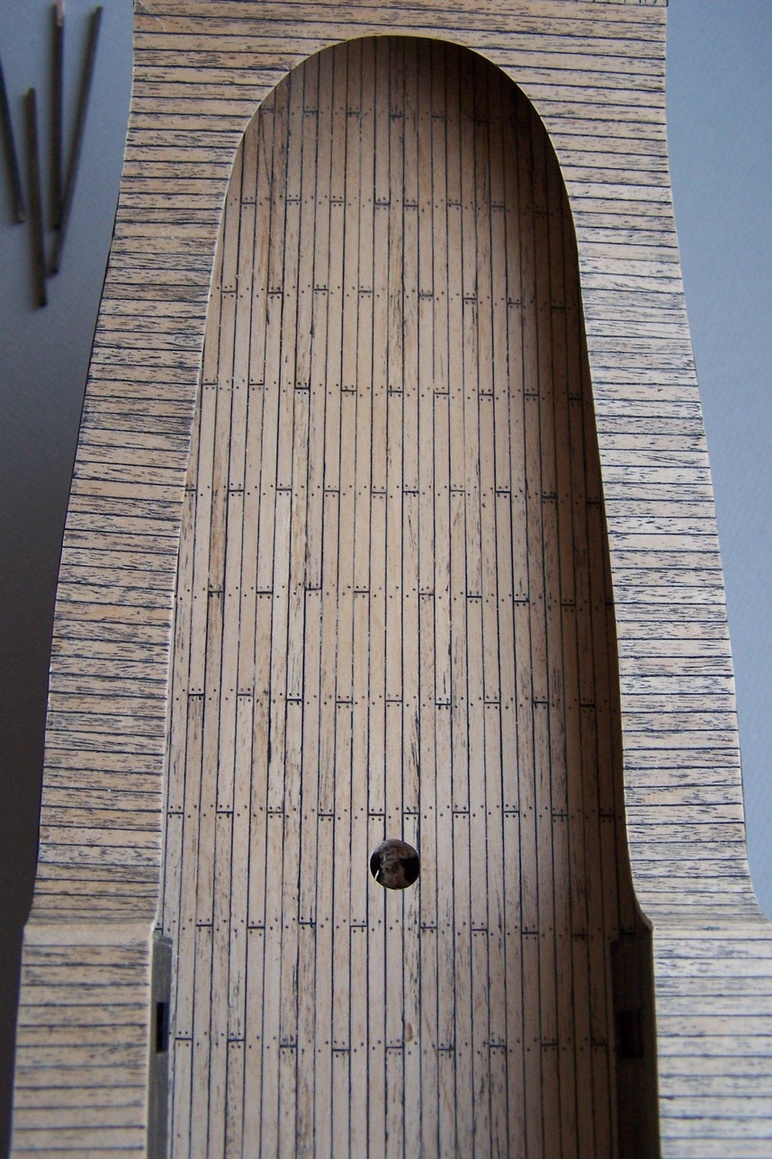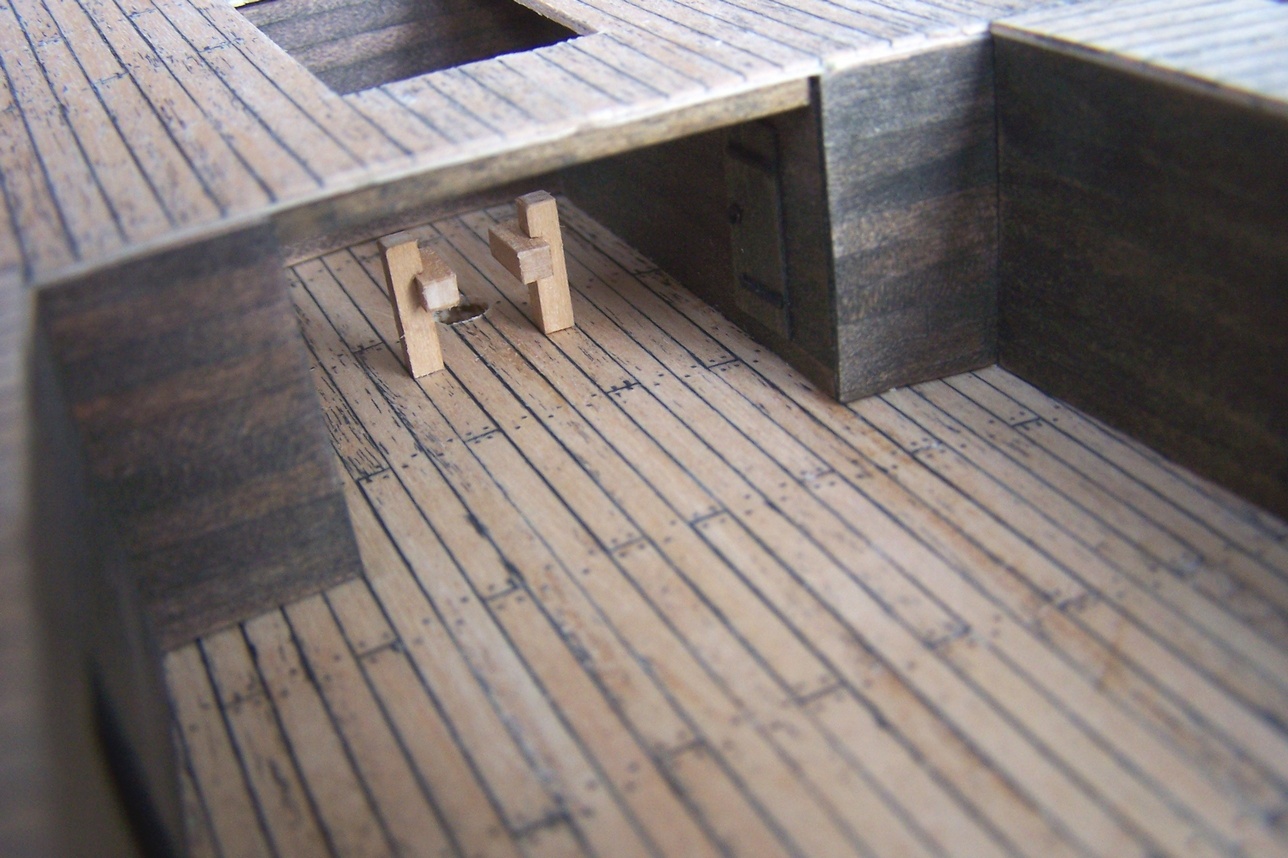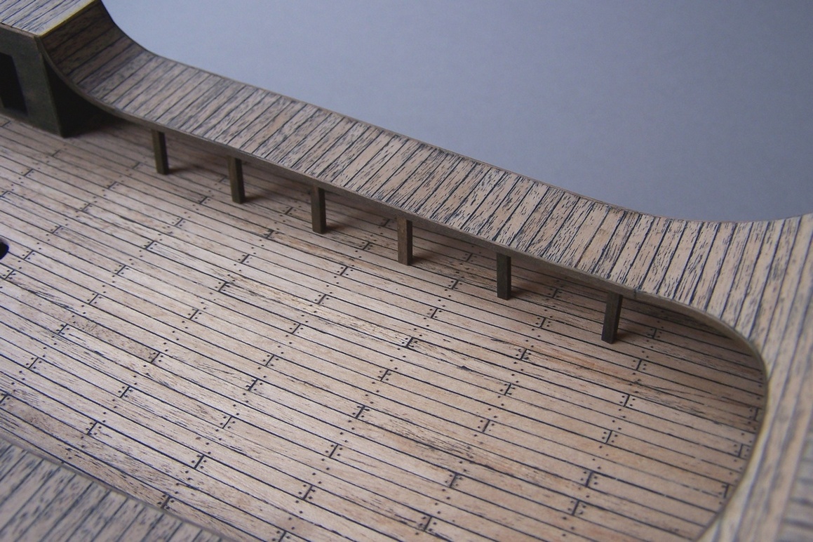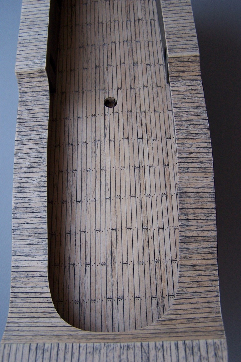 Cześć.Ostatnio miałem więcej obowiązków na głowie to prace trochę zwolniły.Przybyły pomosty wzdłuż burt.I tu zasadnicza różnica między moim modelem a tym z CMM.Model z muzeum ma zabudowane pomieszczenia wzdłóż całej burty.Takie niby tunele