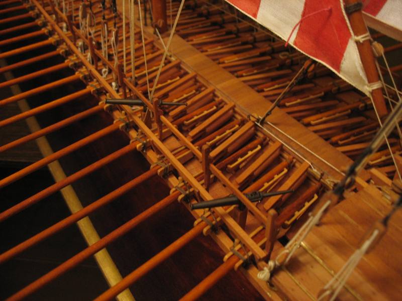 Mam jednak wątpliwości co do ustawienia dulek. Znajdując się od strony rufy powoduje że wiosło podczas pracy nie opiera się na dulce lecz na samym przewiązie z liny. Dulka od strony dziobu dawałaby punkt podparcia dla wiosła w fazie pracy.