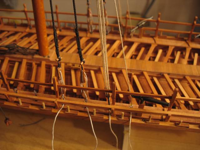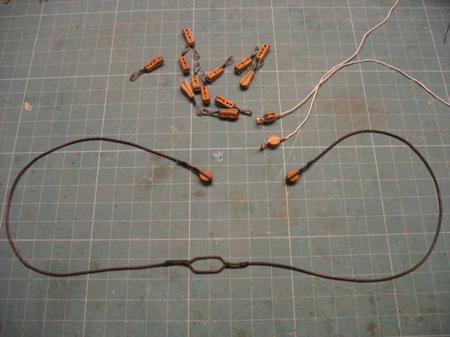 Rozpoczynam prace przy olinowaniu ,bloczki i takie tam drobiazgi. Te ciemne linki oczywiscie od Mirka impregnowane najnowszą miksturą są rewelacyjne i znakomicie się wiąże wszelkie bloczki na nich.