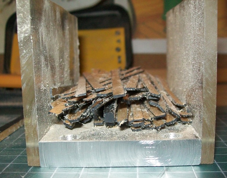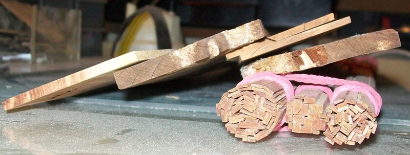 Tym razem listewki brzozowe docięte na grubość 4 mm oszlifowałem w ścierarce grubościowej, następnie pomalowałem miksturą "made in Stefan" - lakier, rozpuszczalnik nitro oraz grafit (czyli materiały których mam w bród po przygotowaniach do metody Baranova...) Po wyschnięciu cięte juz na właściwy wymiar. Teraz czekają na przeszlifowanie i klejenie. Myślę że tym razem będzie ok :)