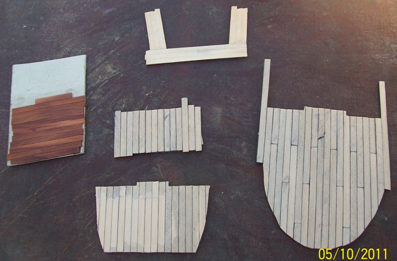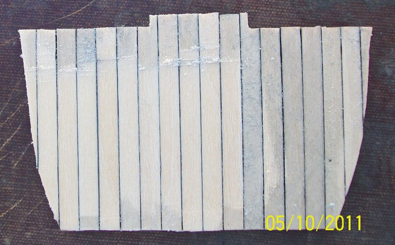 A tu sobie zamontowałem jeden pokład - ten tylni. Byłem ciekawy jak się to wszystko prezentuje w "kupce". Dodatkowo wyznaczyłem sobie linię od której będę poszywał burty - chcę to zrobić jak najszybciej, aby odciąć "wąsy" pomocnicze oraz zamontować pokład główny. Wydaje się że listeweczki Mirka będą się bardzo fajnie gięły - podobno po moczeniu w gorącej wodzie jeszcze lepiej...