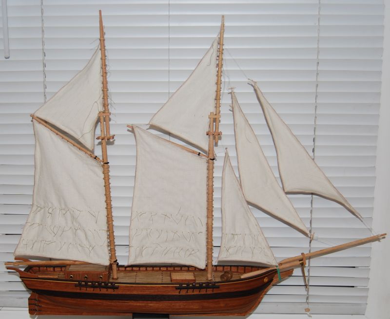 Właśnie się dopatrzyłem że nie ma ciągu relacji. Już się poprawiam. Na planie jest aby uzbroić jednostkę w 6 armat. Wystają one jednak ponad burtę tak jakby jednostka była dozbrojona w okresie późniejszym. Nie wiem czy nie zrezygnować z armat ponieważ kłóci mi się to wizualnie ( armata bez furty pod nią ?) Pokład przy użyciu papieru ze sklepu artystycznego w arkuszu A3 i kołków z wykałaczek wierconych na 0,6 mm wyszedł chyba nie najgorzej. Na lustrze rufy wstawię jeszcze półkoliste rzeźbienie ( jakieś liście ) oraz tabliczkę z nazwą rzeźbioną na proporcu podwójnie przeplecionym. No chyba że powieszę wcześniej szalupę i mi całość rufy za słoni to po co mój trud :-) Roboczo wiszą żagle. Dałem ciała bo nie wiem czy drzewce zostawić takie jasne tylko poolejowane i same ściemnieją czy może je strzelić na teek. Wiąże że to jednak z odcięciem jednego żagla od rei ( czy jak tam ona się zwie na gaflu )