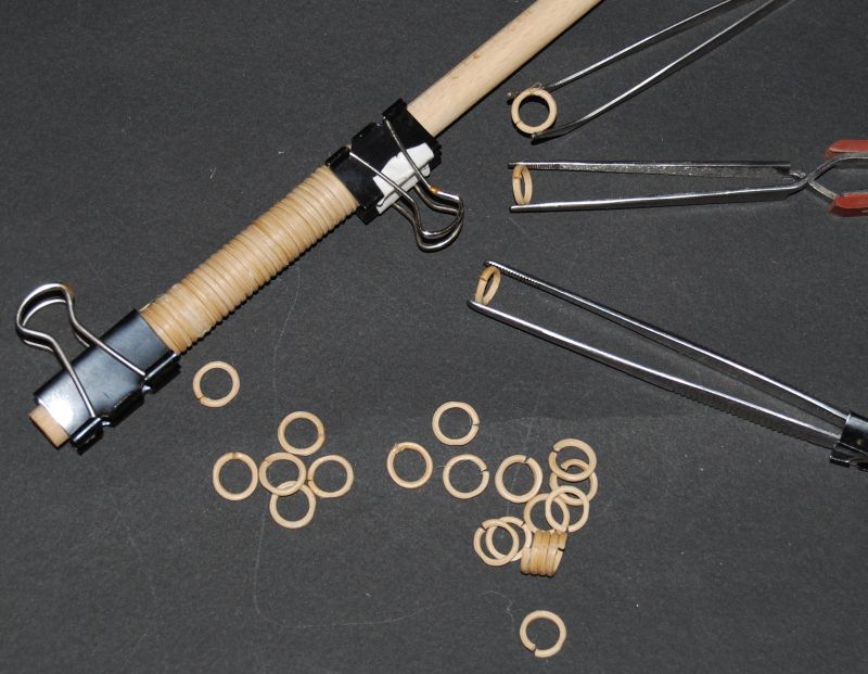 Z braku drutu mosiężnego zastanawiałem się nad użyciem innego materiału na Segarsy. Przypomniałem sobie że mam bambus wypruty na mokro ze starych zużytych lamp papierowych z IKEI. Z jednej lampy tego było z 5 m. Tak więc namoczyłem i owinąłem wokoło okrąglaków. Na drugi dzień ku mojemu zdziwieniu kształt się ładnie utrzymał i jest to dość sztywne. Niemniej jednak zalepiłem cyjanopanem punkty styku. Nie będzie punktu styku widać ponieważ w tym miejscu przypadnie "linka" mocująca żagiel do segarsa .Tak prostym sposobem uzyskałem segarsy które wyglądają całkiem niczego jakby je zostawić w naturalnym kolorze.