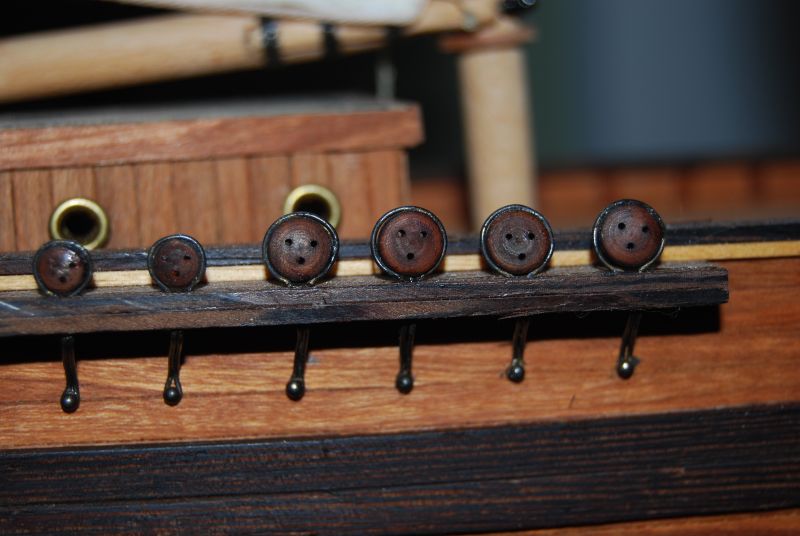 Tak sobie plotę. Nici wantowe plecione z 9 szt do grubości 0,9 mm ((3 x 0,1) x 3)). Przewiąz talrepowa beżowa nic ariadny ADA 15. Wiązania tą samą nicią tylko czernioną. Czernienie bez fanaberii pastą do butów kupioną w Ryłko w tubce z wygodnym apliatorem z pianki która o dziwo nie uległa pocięciu. Następnie po wyschnięciu przetarte terpentyną bezzapachową. Docelowo jeszcze przelecę je olejowoskiem. Po tych zabiegach bez opalania rzadnego włosiwia nie widać o dziwo. Całość wiązań poczynione zgodnie z Lennarth Peretersson "Ringing Period Ship Models ". Na zdjęciu nagle znanej firmy :" Jan Niezbędny" potraktowane w odpowiedni sposób mechanicznie oraz barwione bejcą teak. Jeszcze dostaną olejowosku.