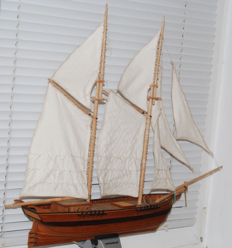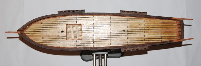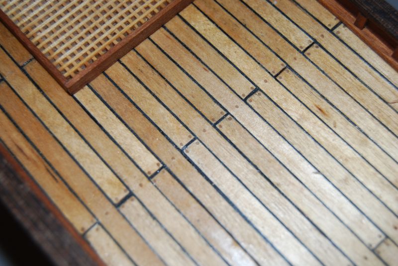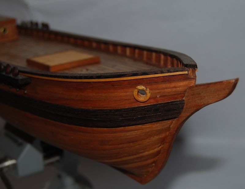 Właśnie się dopatrzyłem że nie ma ciągu relacji. Już się poprawiam. Na planie jest aby uzbroić jednostkę w 6 armat. Wystają one jednak ponad burtę tak jakby jednostka była dozbrojona w okresie późniejszym. Nie wiem czy nie zrezygnować z armat ponieważ kłóci mi się to wizualnie ( armata bez furty pod nią ?) Pokład przy użyciu papieru ze sklepu artystycznego w arkuszu A3 i kołków z wykałaczek wierconych na 0,6 mm wyszedł chyba nie najgorzej. Na lustrze rufy wstawię jeszcze półkoliste rzeźbienie ( jakieś liście ) oraz tabliczkę z nazwą rzeźbioną na proporcu podwójnie przeplecionym. No chyba że powieszę wcześniej szalupę i mi całość rufy za słoni to po co mój trud :-) Roboczo wiszą żagle. Dałem ciała bo nie wiem czy drzewce zostawić takie jasne tylko poolejowane i same ściemnieją czy może je strzelić na teek. Wiąże że to jednak z odcięciem jednego żagla od rei ( czy jak tam ona się zwie na gaflu )