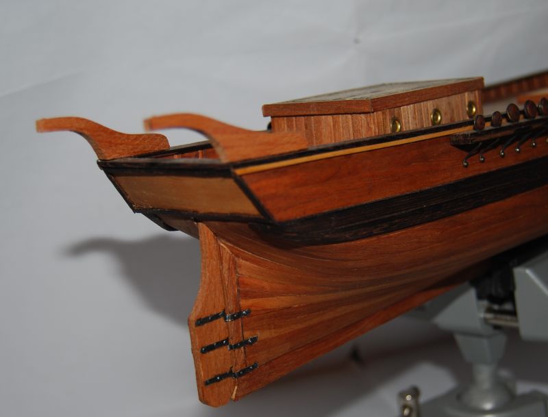 Właśnie się dopatrzyłem że nie ma ciągu relacji. Już się poprawiam. Na planie jest aby uzbroić jednostkę w 6 armat. Wystają one jednak ponad burtę tak jakby jednostka była dozbrojona w okresie późniejszym. Nie wiem czy nie zrezygnować z armat ponieważ kłóci mi się to wizualnie ( armata bez furty pod nią ?) Pokład przy użyciu papieru ze sklepu artystycznego w arkuszu A3 i kołków z wykałaczek wierconych na 0,6 mm wyszedł chyba nie najgorzej. Na lustrze rufy wstawię jeszcze półkoliste rzeźbienie ( jakieś liście ) oraz tabliczkę z nazwą rzeźbioną na proporcu podwójnie przeplecionym. No chyba że powieszę wcześniej szalupę i mi całość rufy za słoni to po co mój trud