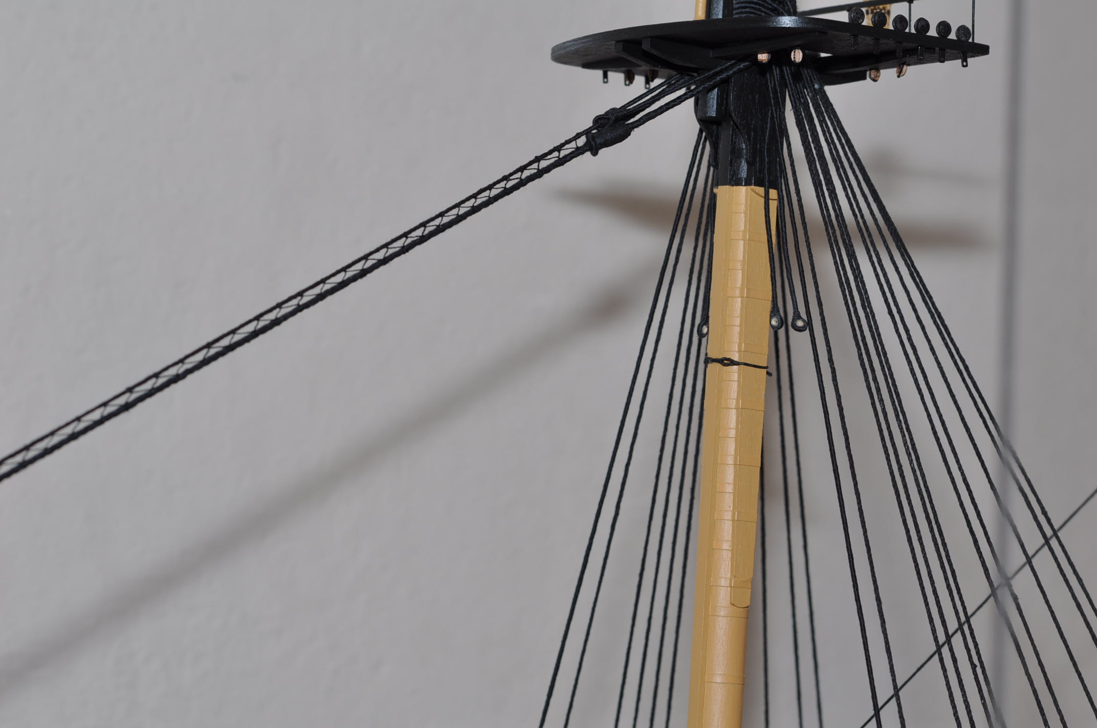 Szkoda natomiast, że nie pokusiłeś się przy wykonaniu sztagu o jego wypełnienie liną tzw. worming. Przy twojej skali byłoby to możliwe do zrobienia i ciekawie by to wyglądało. Oczywiście jeśli to uczyniłeś, a ja nie dostrzegam tego na fotkach to zwracam honor