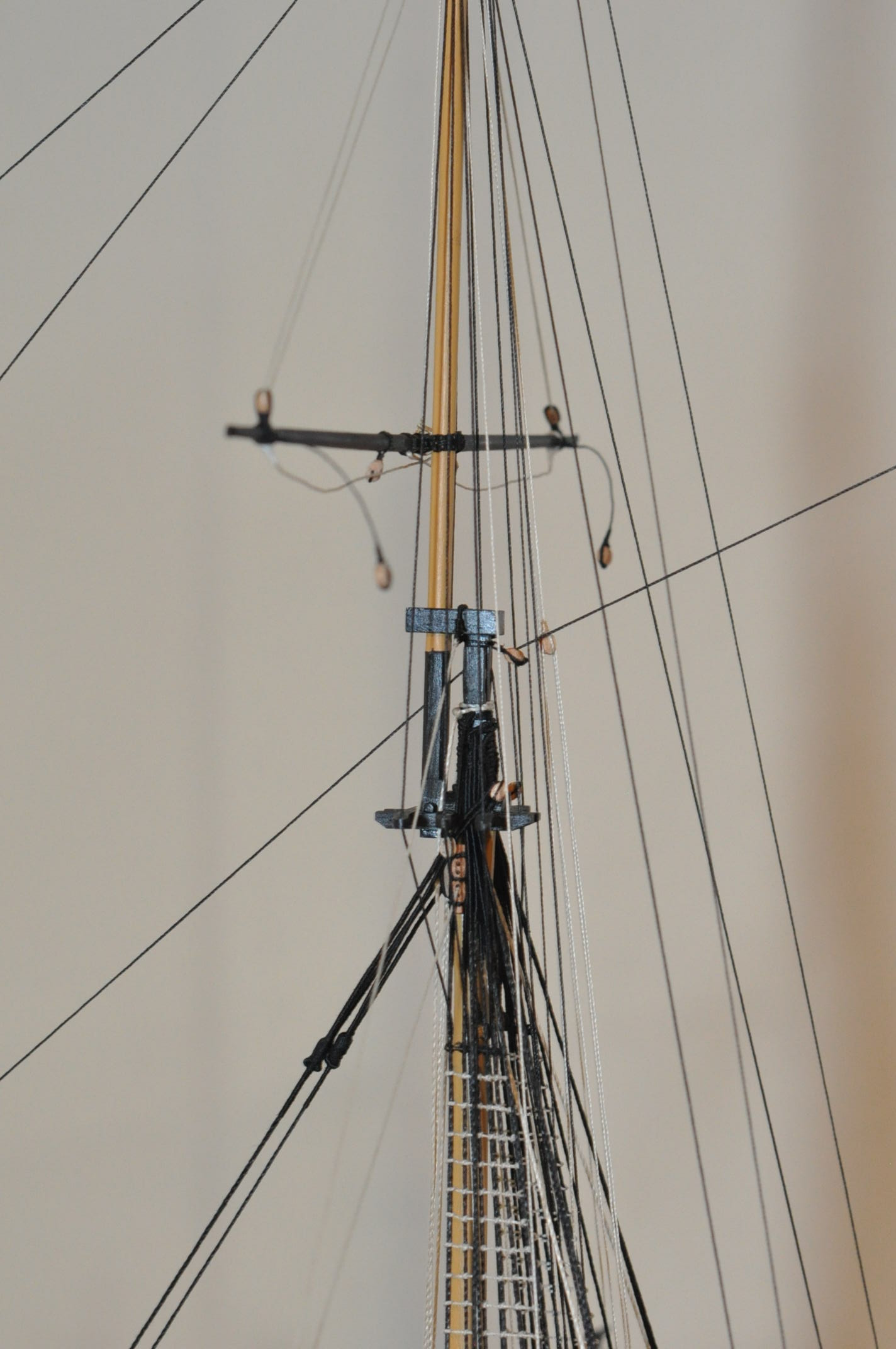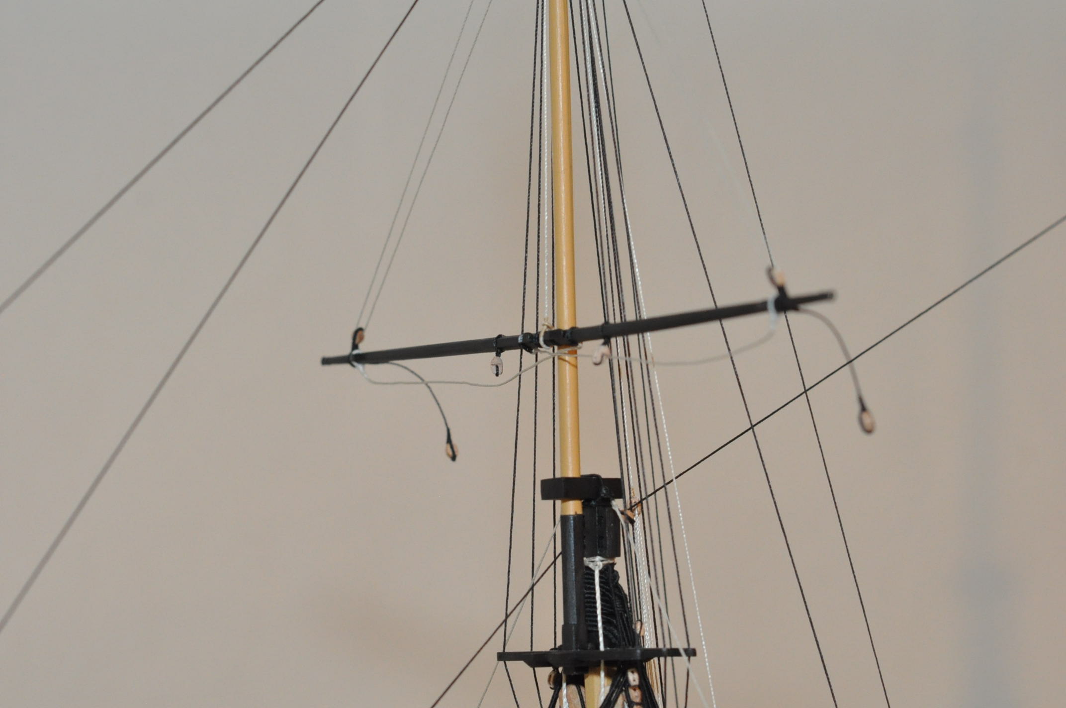 Powiesiłem wszystkie reje na fokmaszcie. Zawiązałem sling ,więźbę , windy , topenanty dla fokreji oraz więźbę , cięgła i topenanty dla dwóch pozostałych . Teraz będę wieszał reje grotmaszcie