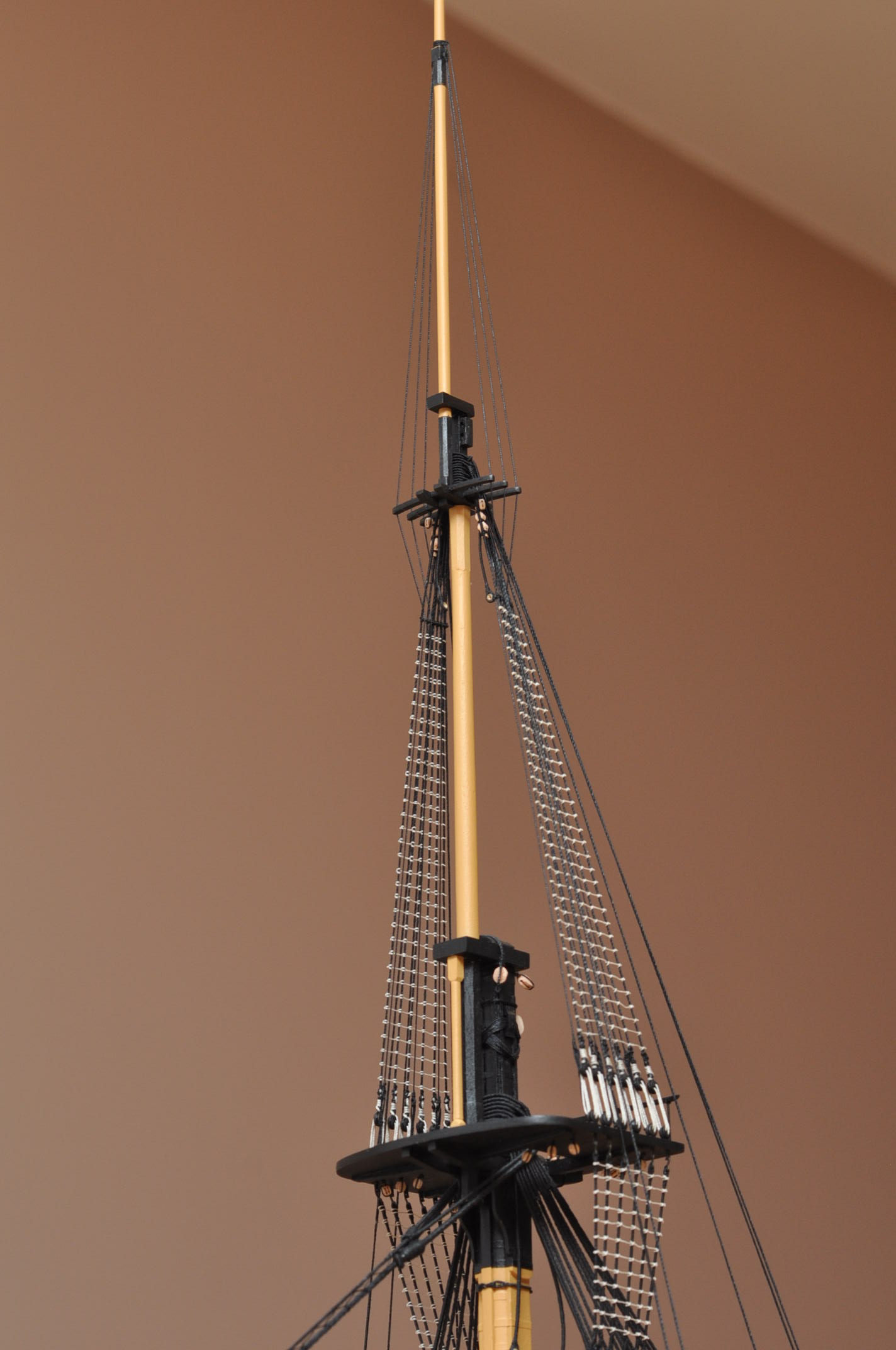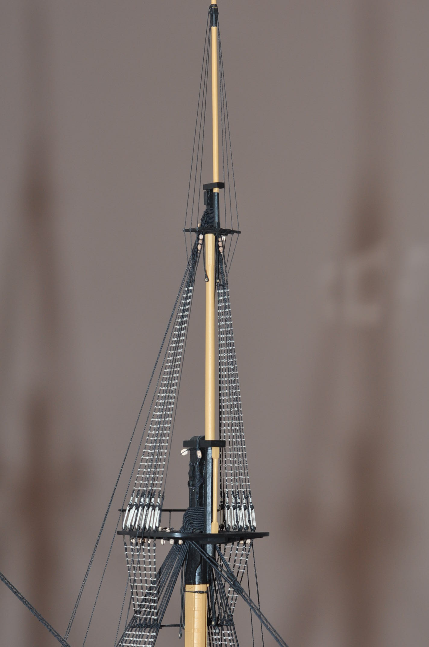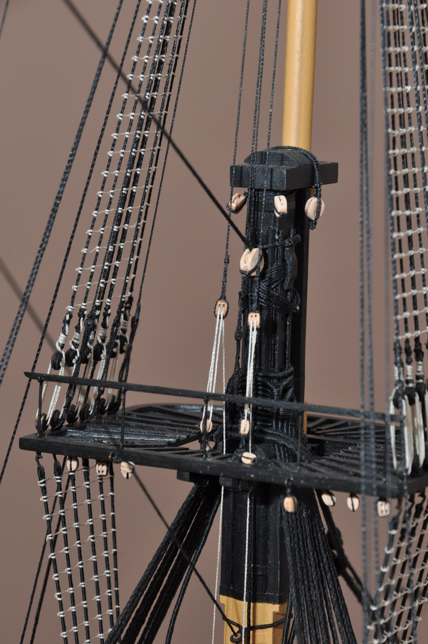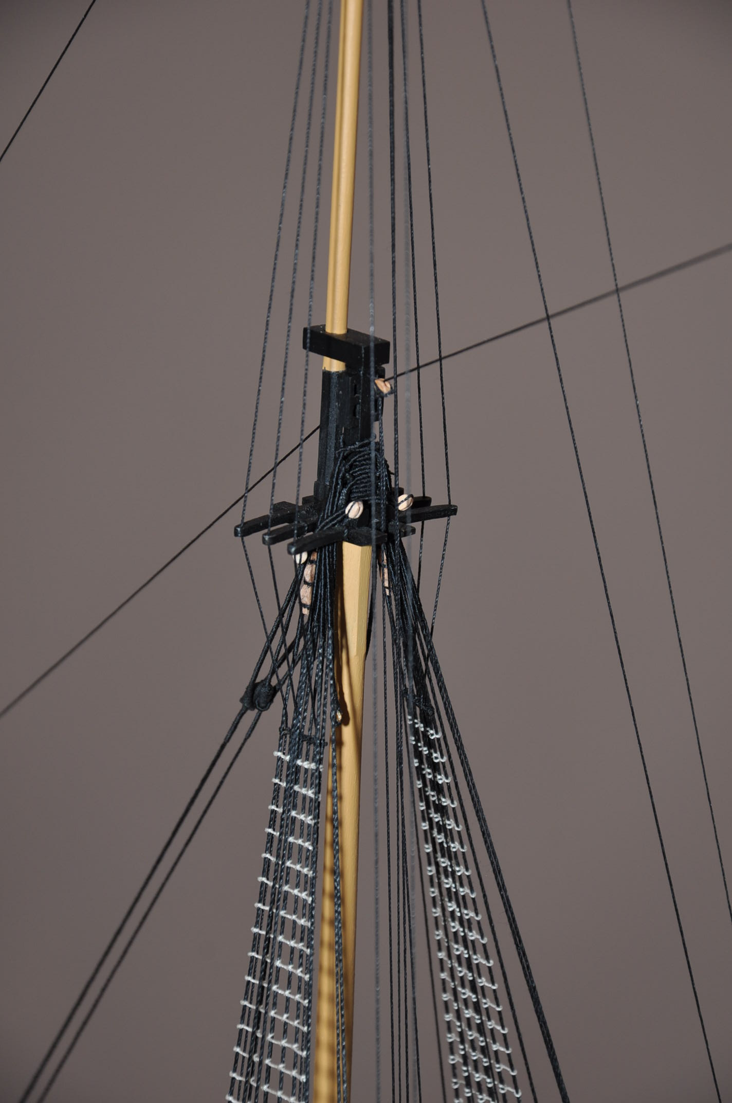 Bramstenwanty oraz fokstensztag i pomocniczy fokstensztag zawieszone na modelu .