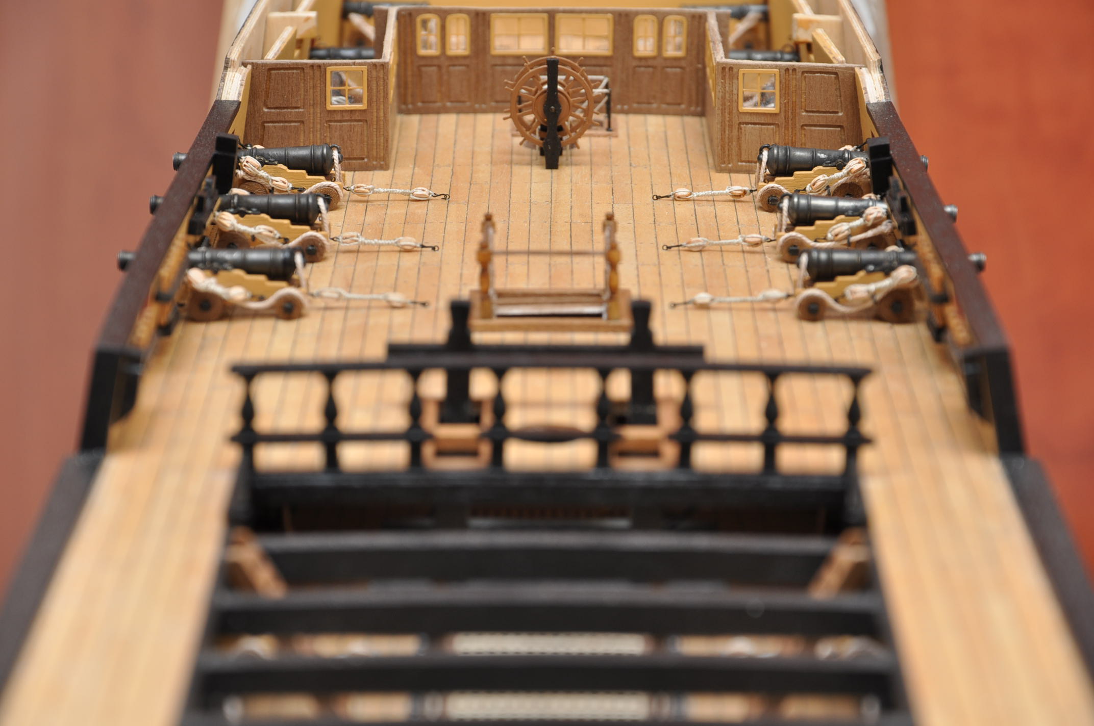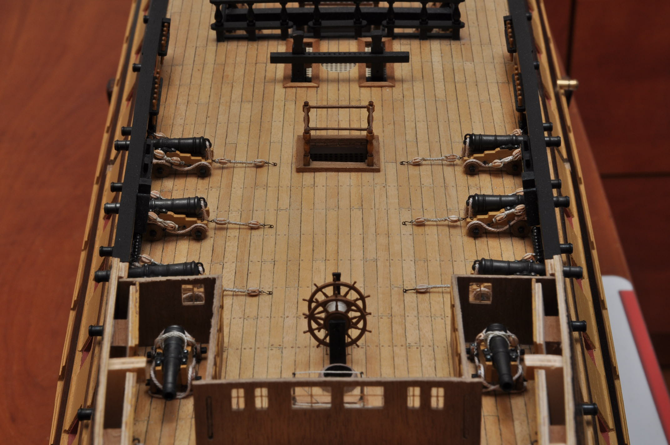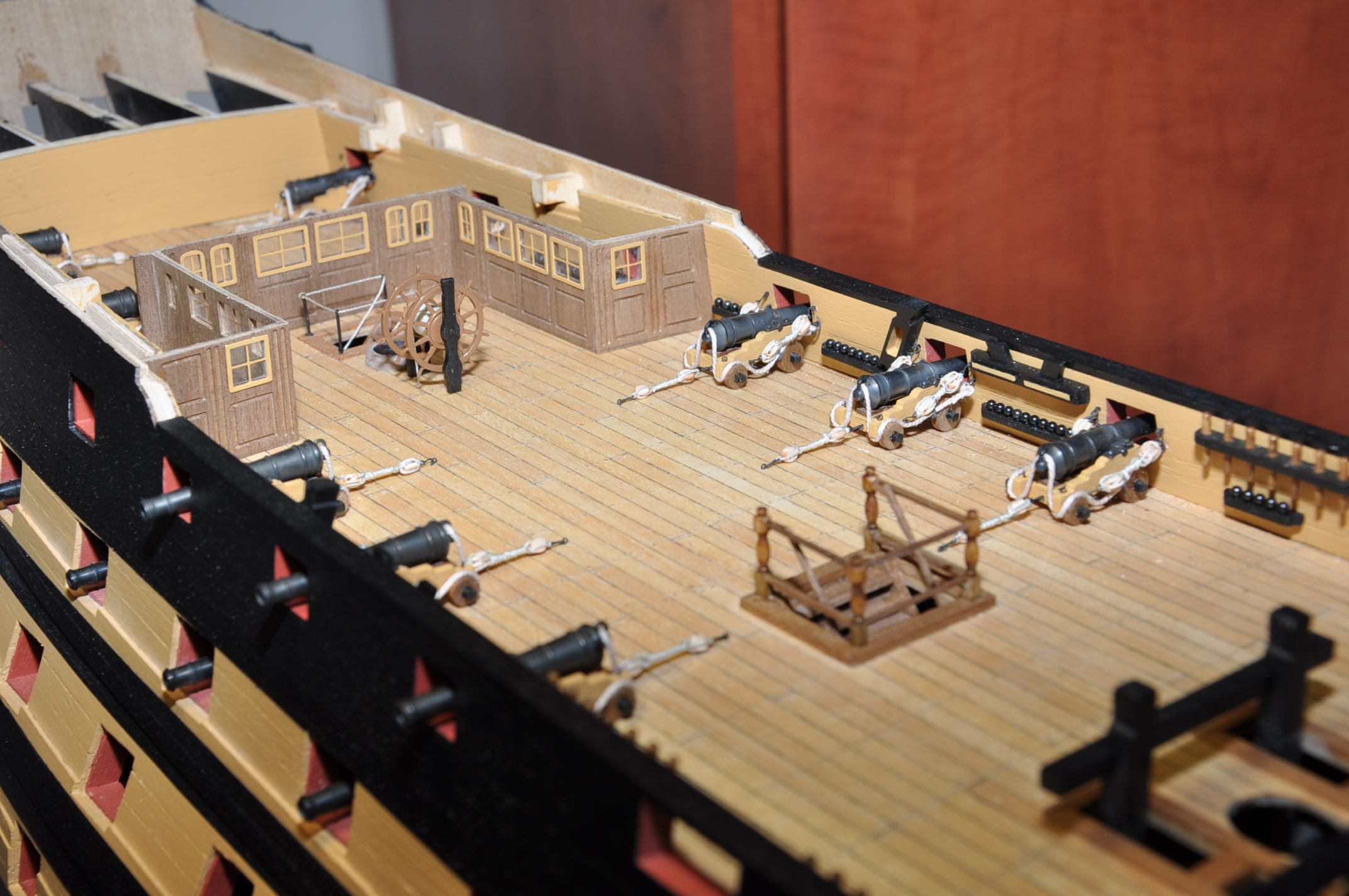 Witam . Uzbrajanie Viktora powoli zbliża się do końca (te widoczne -zostają jeszcze atrapy luf na niższych pokładach ). Za sugestią Jarcia ustawiłem 12 funtówki na fordeku przy burtach . Poza tym dodane koło sterowe .Pozdrawiam