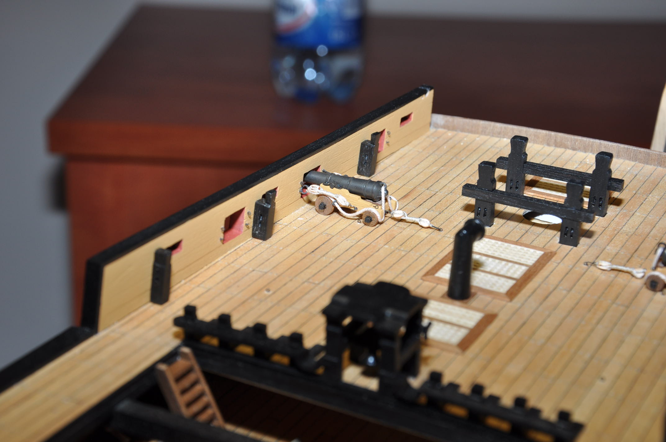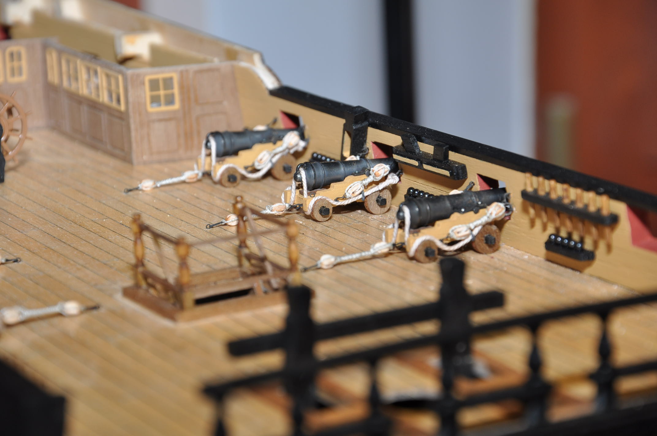 Witam . Obecnie jestem na etapie uzbrajania quarterdecku w armaty 12 funtowe . Ustawiłem armaty stojące przy burtach ,to poszło w miarę łatwo . Problem pojawił sie przy armatach tzw. dlugich 12 funtowych. Ustawione powinny być rownolegle do burt na kasztelu dziobowym mniej więcej pośrodku pokładu (2 armaty ) . Mam pytanie odnośnie właściwego zamocowania talii , lin hamujących dla tych armat. Z góry dziękuje za odpowiedz . Pozdrawiam