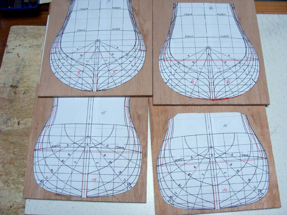 Sposób budowy kadłuba jak przy galeonie.Wręgi ze sklejki 7,5 mm. na okrągłym wałku fi 22 wycięte aż do podstawy pierwszego pokładu.Świerkowe beleczki utworzą skorupę kadłuba który po oszlifowaniu będzie punktem wyjściowym do dalszych prac.Aby ułatwić sobie pracę na miejscu abrazur zostawiam wolny pas.Będą pasowane na końcu.To tyle.Reszta fotki.Dodam tylko,że skala 1:50.Więc będzie przy czym dłubać.Pozdrawiam.Kazimierz.
