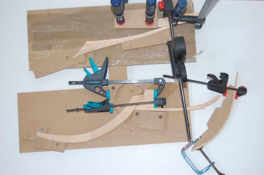 Pawęż przygotowywałem w "międzyczasie" plankowania (rys 7). Dokleiłem do stewy i ustawiłem symetrię blokując od strony kopyta wklejając po obu stronach bloki zaporowe. Możliwe było klejenie dalszych planek (rys 8). Konieczne stało się wydłużenie kopyta poprzez wstawienie wręgów z MDF i ich ustabilizowanie aby się nie kiwały (rys 9) Wykonaną na kopycie wyższą część pawęży (rys 10) dokleiłem i znowu planki w górę (rys 11 i 12)