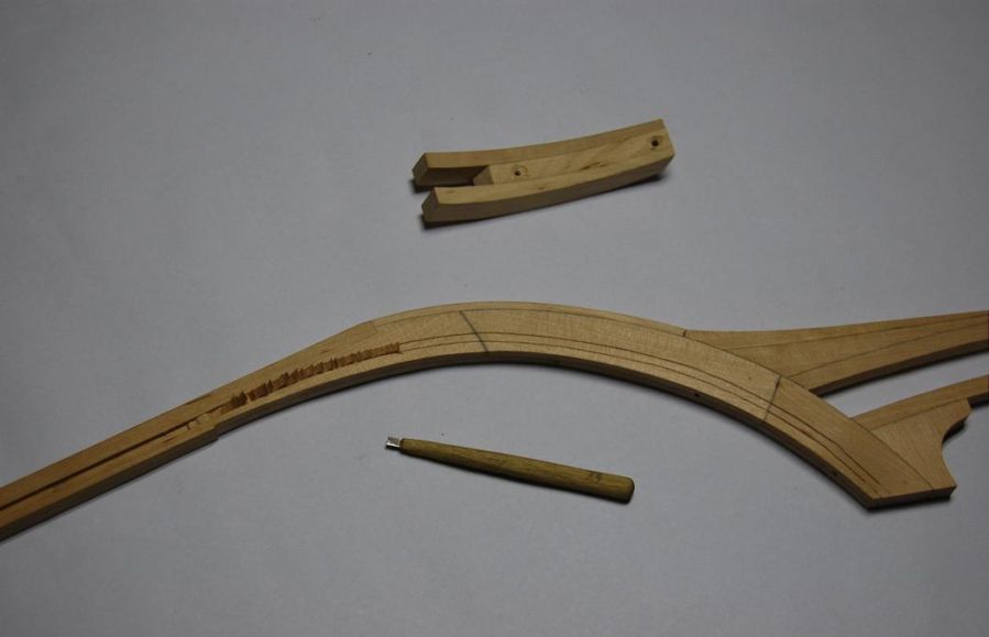 Budowę rozpocząłem standardowo od sklejenia obu stew oraz stępki w jedną całość. Stępka klejona była z dwóch listew złożonych "brzuchami" do zewnątrz na płaskim stole. Stewa dziobowa z przygotowanego posklejanego elementu (rys 1) na którym wyrysowałem właściwy kształt i wyciąłem. Potem do stewy doklejałem dziób galionu - elementy po kolei zgodnie z liniami podziału (rys 2). Na koniec całość na szlifierce taśmowej zeszlifowałem obustronnie na płasko. W stewach należało zrobić wcięcie na planki (kil wcześniej został frezowany na pilarce tarczowej proxxon) - dłutowałem je własnoręcznie przygotowanym dłutem o właściwej szerokości (rys 3). Cały element ustabilizowałem na kopycie (rys 4) przy pomocy sporych wkrętów. Podczas doklejania nowych planek całość musiała być wielokrotnie zdejmowana z kopyta dla skorygowania kształtu krawędzi (na rys 5 widać że planka dziobowa ma niewłaściwy kształt - zawsze dawałem z naddatkiem który potem usuwałem zdejmując każdorazowo skorupę z kopyta). Kolejne planki doklejałem dobijając klinami dla całkowitego wyciśnięcia nadmiaru kleju.