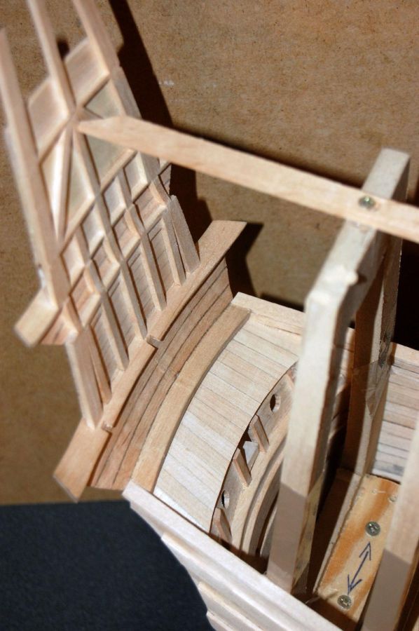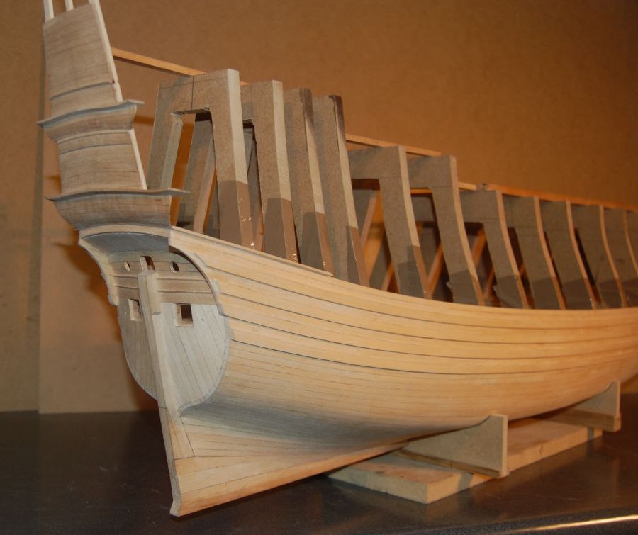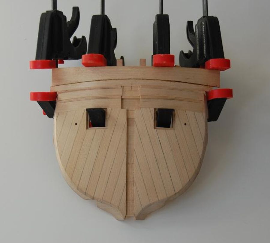 Po wykonaniu poszycia do czwartej odbojnicy musiałem ze środka wyjąć kopyto. Wkleiłem stałe wręgi z MDF-u i wypoziomowałem oraz wkleiłem stałą wodnicę. Do niej na powrót dokręciłem na wkręty wręgi i pociągnąłem poszycie w górę aż do listwy ozdobnej na której się zatrzymałem (chciałem mieć łatwiejszy dostęp do wnętrza kadłuba). Wręgi wywaliłem i wyciąłem ambrazury (rys 13 i 14). Następnie powklejałem skrzynki ambrazur i stałe wręgi (rys 15). Jednocześnie mogłem już wyciąć otwory w pawęży (rys 16) i przykleić policzki galionu (rys 17 i 18).