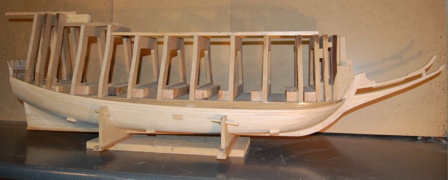 Budowę rozpocząłem standardowo od sklejenia obu stew oraz stępki w jedną całość. Stępka klejona była z dwóch listew złożonych "brzuchami" do zewnątrz na płaskim stole. Stewa dziobowa z przygotowanego posklejanego elementu (rys 1) na którym wyrysowałem właściwy kształt i wyciąłem. Potem do stewy doklejałem dziób galionu - elementy po kolei zgodnie z liniami podziału (rys 2). Na koniec całość na szlifierce taśmowej zeszlifowałem obustronnie na płasko. W stewach należało zrobić wcięcie na planki (kil wcześniej został frezowany na pilarce tarczowej proxxon) - dłutowałem je własnoręcznie przygotowanym dłutem o właściwej szerokości (rys 3). Cały element ustabilizowałem na kopycie (rys 4) przy pomocy sporych wkrętów. Podczas doklejania nowych planek całość musiała być wielokrotnie zdejmowana z kopyta dla skorygowania kształtu krawędzi (na rys 5 widać że planka dziobowa ma niewłaściwy kształt - zawsze dawałem z naddatkiem który potem usuwałem zdejmując każdorazowo skorupę z kopyta). Kolejne planki doklejałem dobijając klinami dla całkowitego wyciśnięcia nadmiaru kleju.