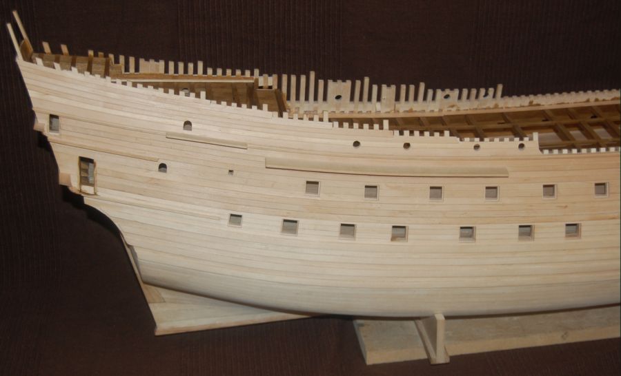 Po wykonaniu całego kadłuba pobejcowałem go na jasny dąb i dodałem galeryjki rufowe (rys 31).