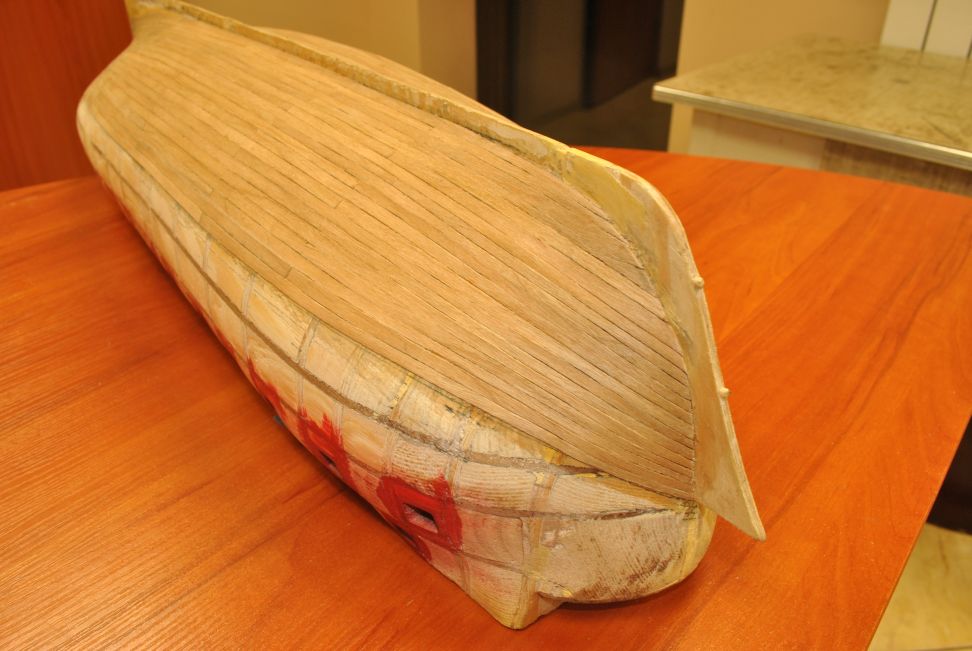 Pobawiłem się trochę w przyklejanie drugiego poszycia części podwodnej. Zamieniłem fornir z mahoniu na czereśnię amerykańską. Z tą czerśnią jest trochę kłopotu, ponieważ trzeba wyszukiwać miejsc bez słojów pomiędzy słojami. Środek jest cały w kółka i nic się z tego nie da zrobić. Jednak efekt po oleju lub pokoście jest zadawalający. Jest to stan surowy. Fornir ma 0,6 mm i dlatego szlifowanie będzie ostatnim etapem wykończeniowym kadłuba.