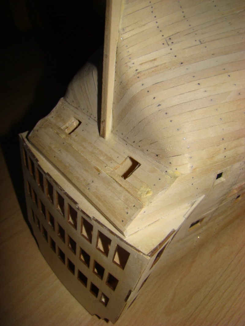 Zamknąłem poszycie, zamontowałem stępkę, stewę dziobową i rufową, galerię rufową i wstępnie oszlifowałem kadłub. Jeszcze trochę szlifowania przede mną