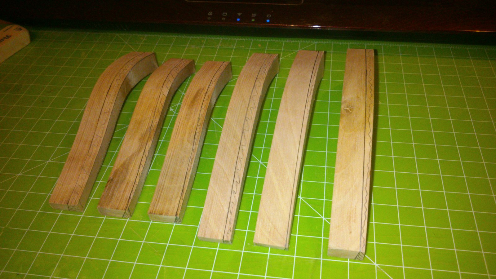 Witam, kołkowanie wręg wykonałem tak jak jest pokazane na animacji komputerowej z budowy La Belle. Wręgi już oszlifowane i zakołkowane no i w końcu zacząłem montaż wręg na kilu. Najwięcej czasu i pracy zajęło mi ich wykonanie oby to już jakoś bez większych problemów "poszło".