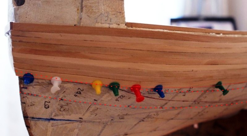 To są nierówności listewek, zresztą niewielkie. Znikną podobnie jak ewentualne szpary po szlifowaniu. Model który buduję nie ma odbojnicy w ścisłym tego słowa znaczeniu. Do ciemnej listwy (pierwszej od pokładu działowego) są listewki 2 mm . ciemna listwa ma 2,5 mm, kolejna będzie miała 3, 3,5 i następna 4. Wszystko to po to :