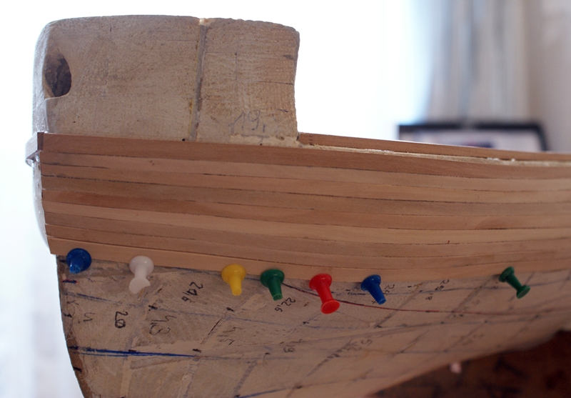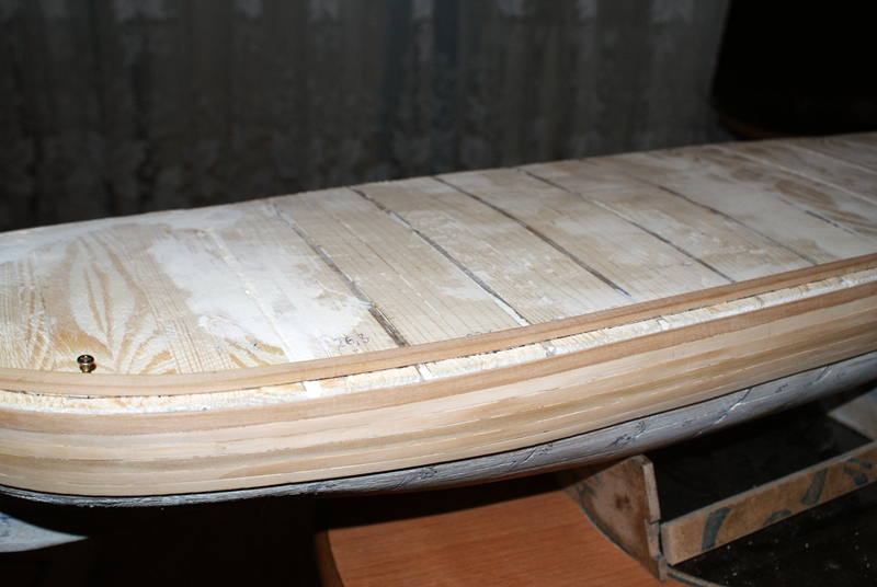 Przy poszywaniu kadłuba nie łącz wszystkich listewek na jednej wysokości. Będzie się to psuło cały efekt. Chyba, że przyjdzie na to jeszcze jedno poszycie.
