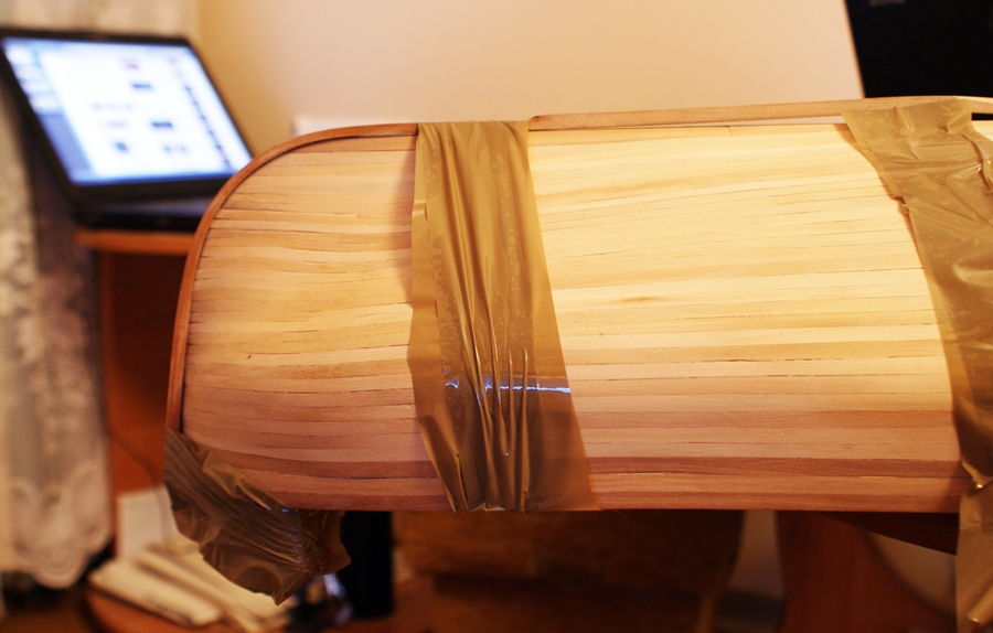 W najszerszym miejscu kadłuba pozostało 72 mm kadłuba do poszycia. Planki mają 6 mm szerokości, pozostało 12 planek - 72/12 = 6 mm.