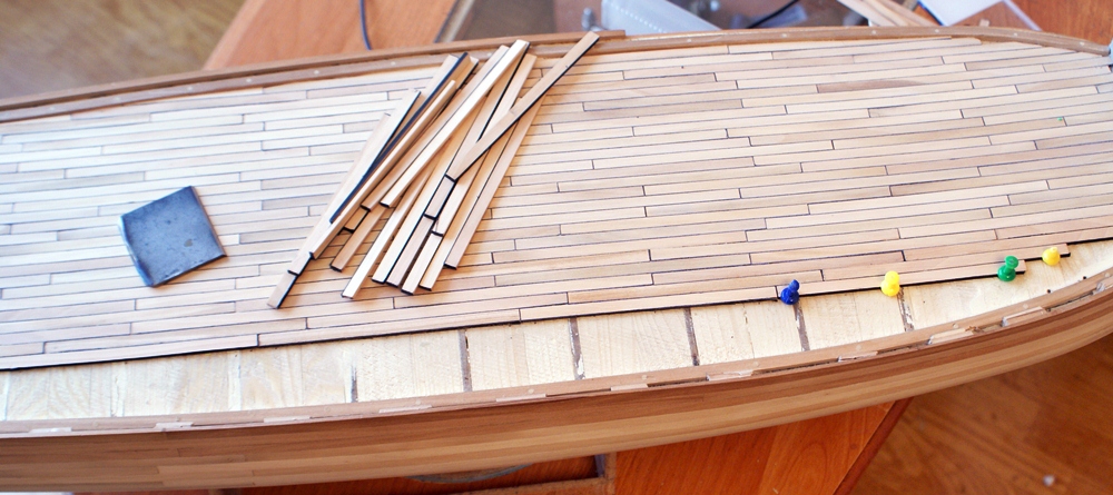 Planki za mało zwężają się w kierunku dziobu. Teraz na środku masz jeszcze dużą szerokość do pokrycia, a przy dziobie bardzo małą. Tu już nic nie zrobisz