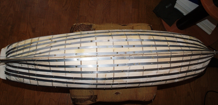 Lay this first batten about 10mm from the keel. DO NOT FORCE the batten into position. It must lie where it wants to go without being forced laterally across its width. If it is forced against its natural flow any other planks cut to this shape will also cause problems when it comes to their laying. Space the other battens as mentioned before at the calculated width to suit your particular planking. Again lay these battens in a natural flow try to obtain something of an equal spacing particularly at the stem and stern areas if possible. If this can’t be obtained do not worry unduly as other methods can be used to break up the pattern and thereby reduce the number of planks going to the problem section. These methods will be dealt with later in a separate section.