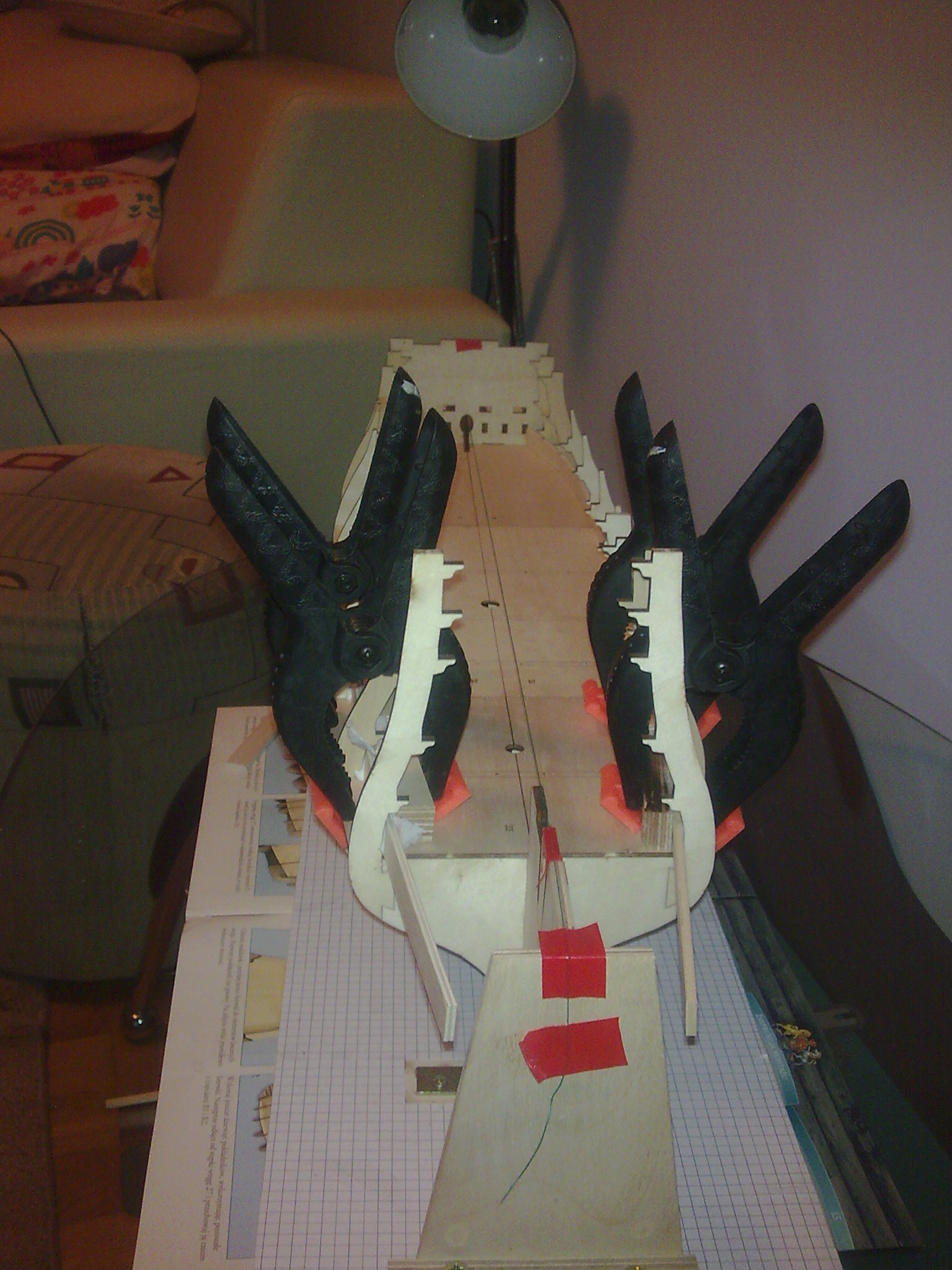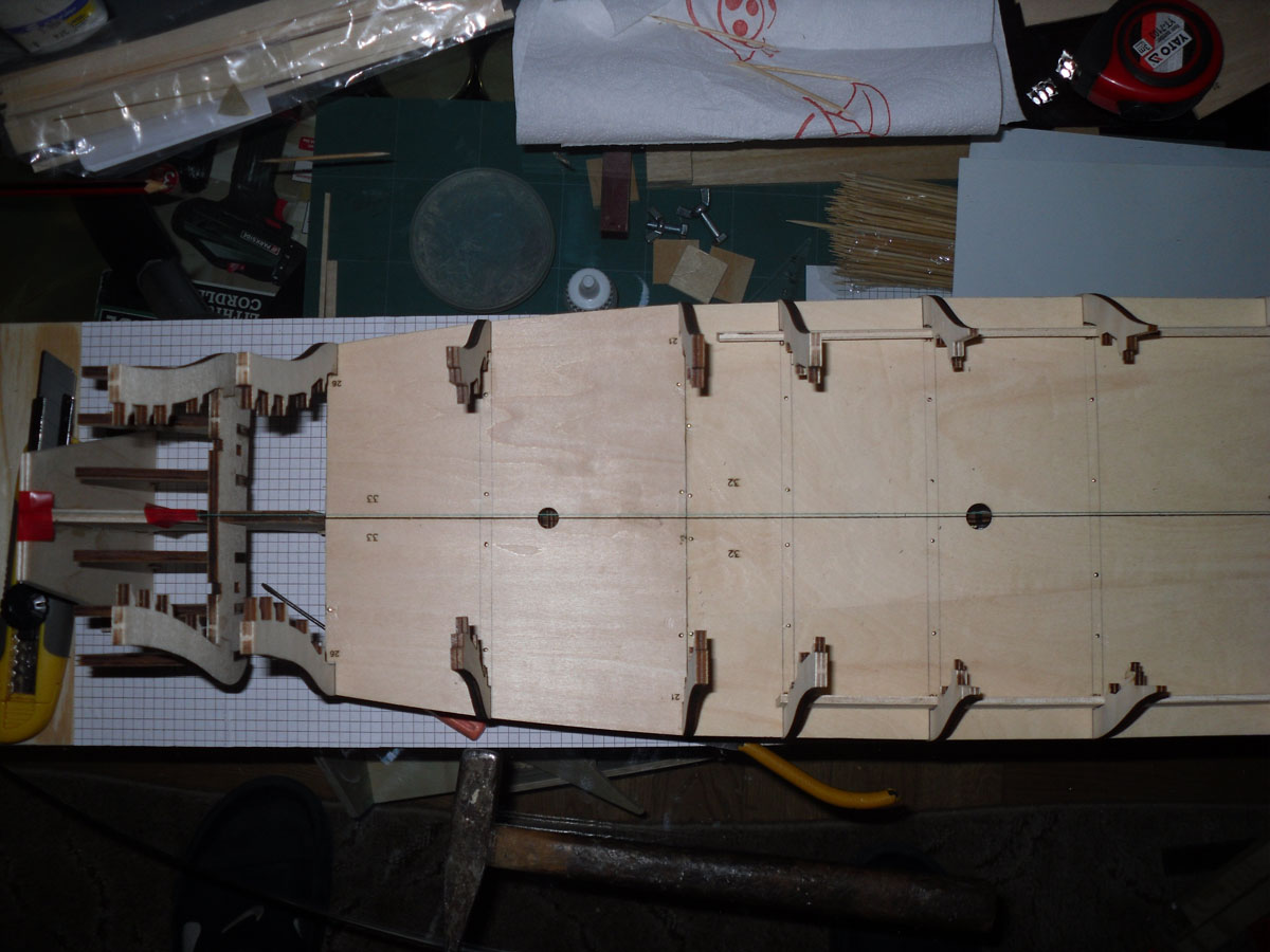 Zmontowałem stępkę na prowizorycznej stoczni, którą widać na zdjęciu dodanym poniżej. Wręgi okrętu prostowałem, ale cieszy mnie tylko fakt, że nie było zbyt wiele elementów do prostowania, następnie wszytko skleiłem. Teraz jestem na etapie montowania stoczni z planów, które znalazłem. Po jej zmontowaniu zabieram się za łączenie stępki z wręgami. A oto kilka zdjęć z montażu stepki.