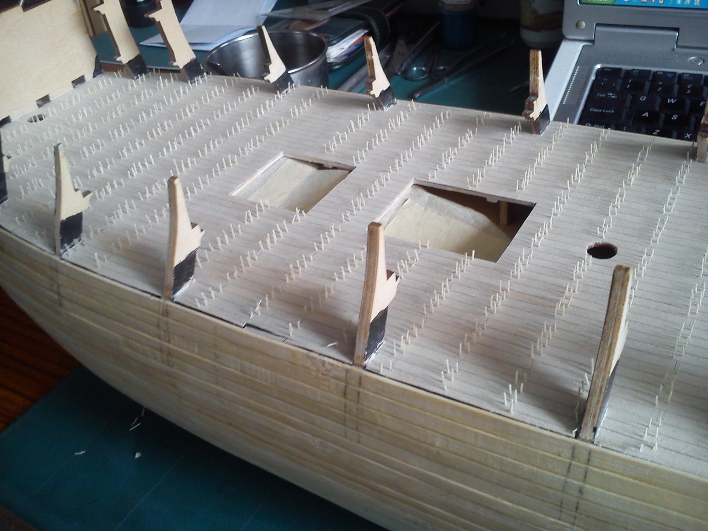 Oczywiście przed kołkowaniem wstępnie oszlifowałem pokład ,aby mieć mniej pracy potem . Nie będę musiał szlifować całego pokładu, zostanie mi tylko szlifowanie samych kołeczków .