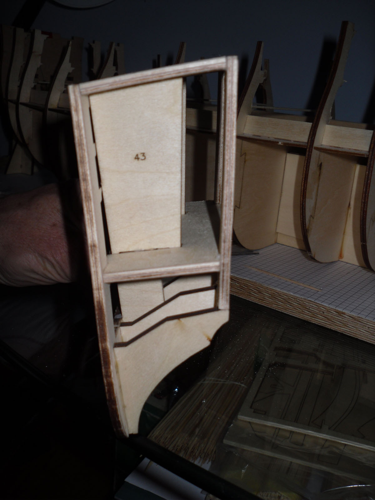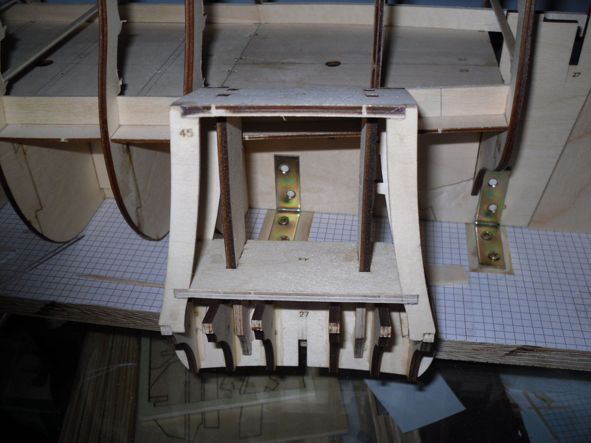 Kolejny etap to montaż wzdłużników miedzy pokladem 1 a pokładem 2 oraz pokładniki . Dolny poklad nr1 bedzie niewidoczny przez luki działowe . Zamontwane zostaną tam atrapy dział. Wkleiłem też szkielet galeryjki rufowej.