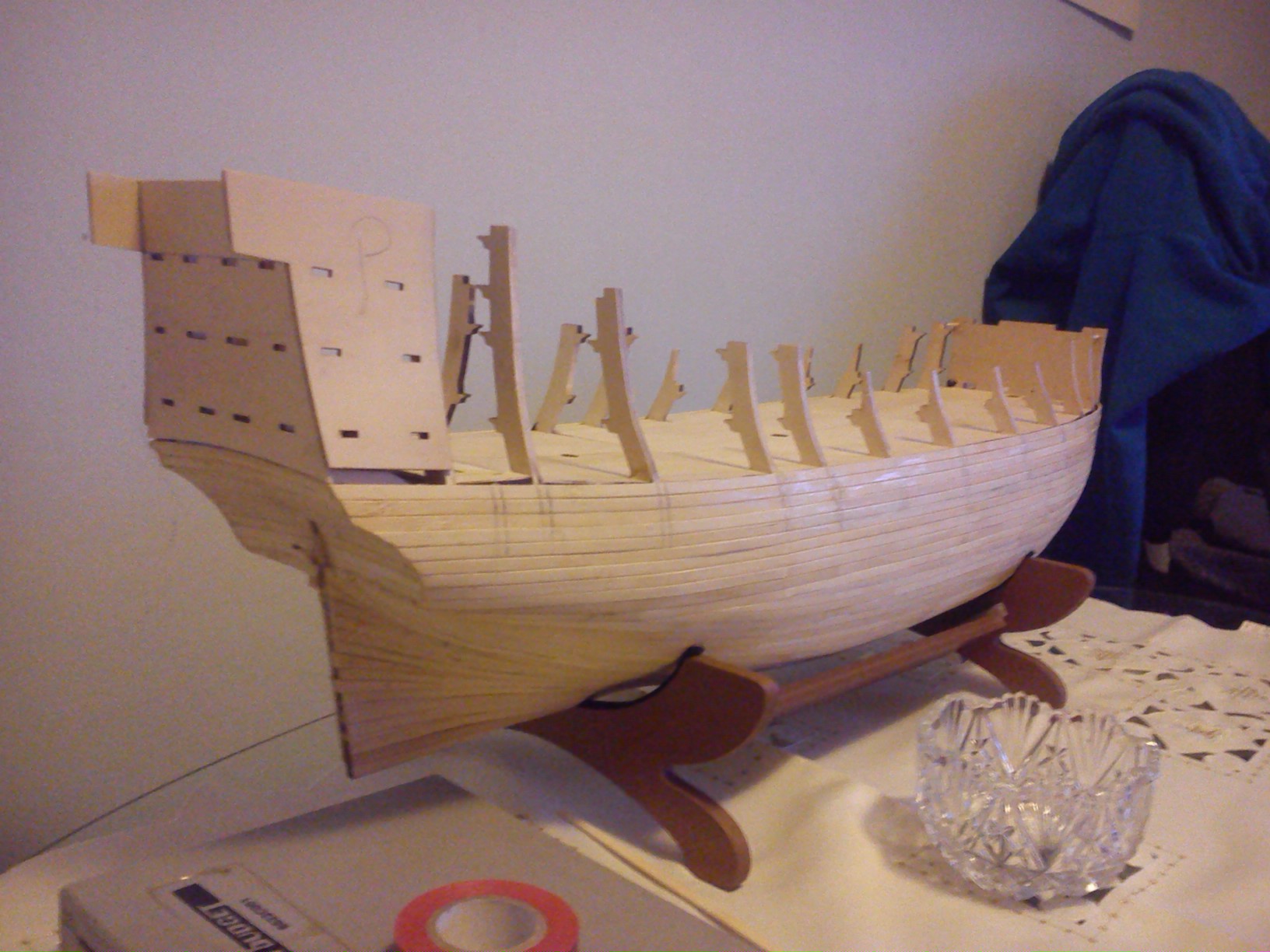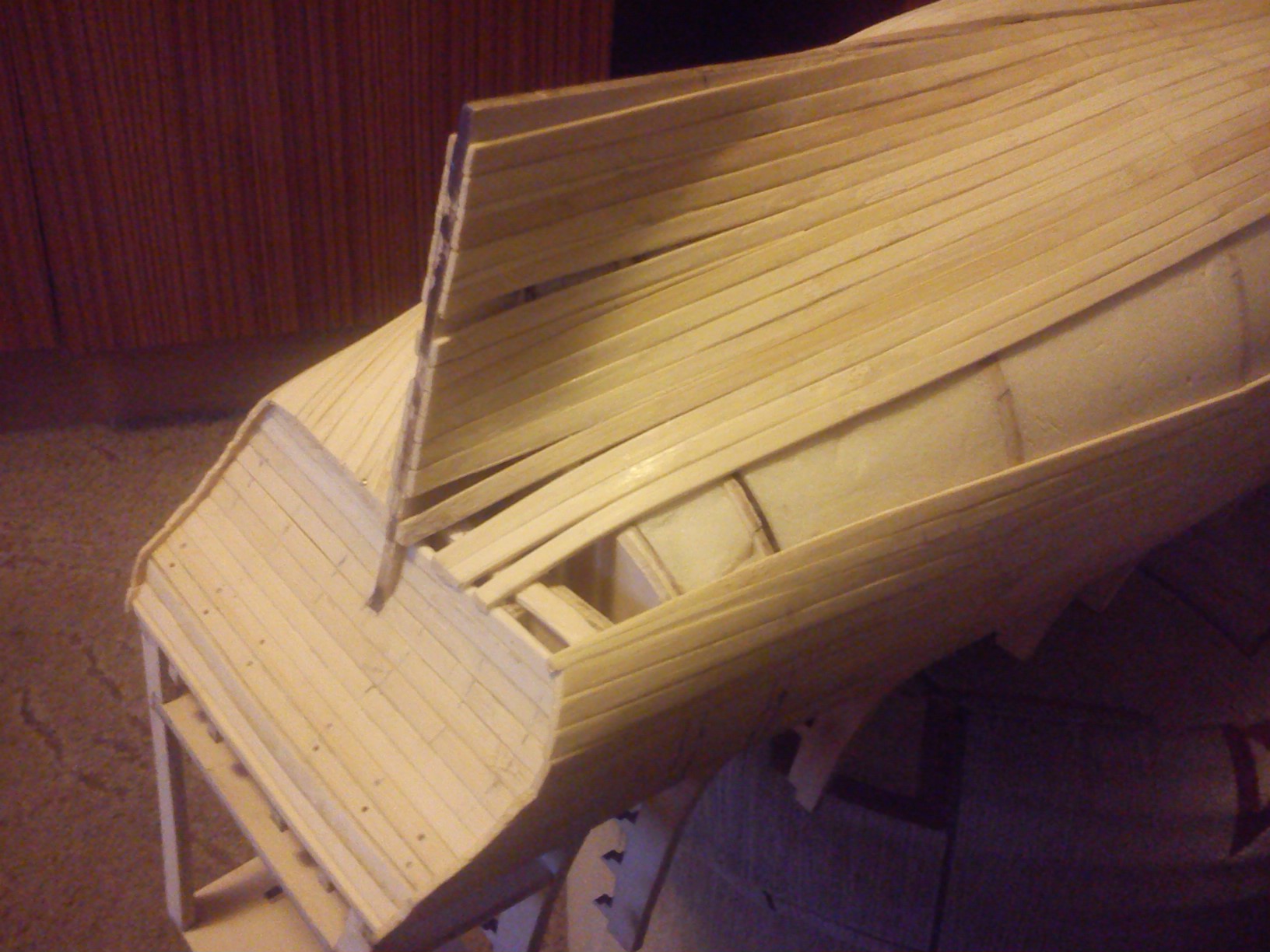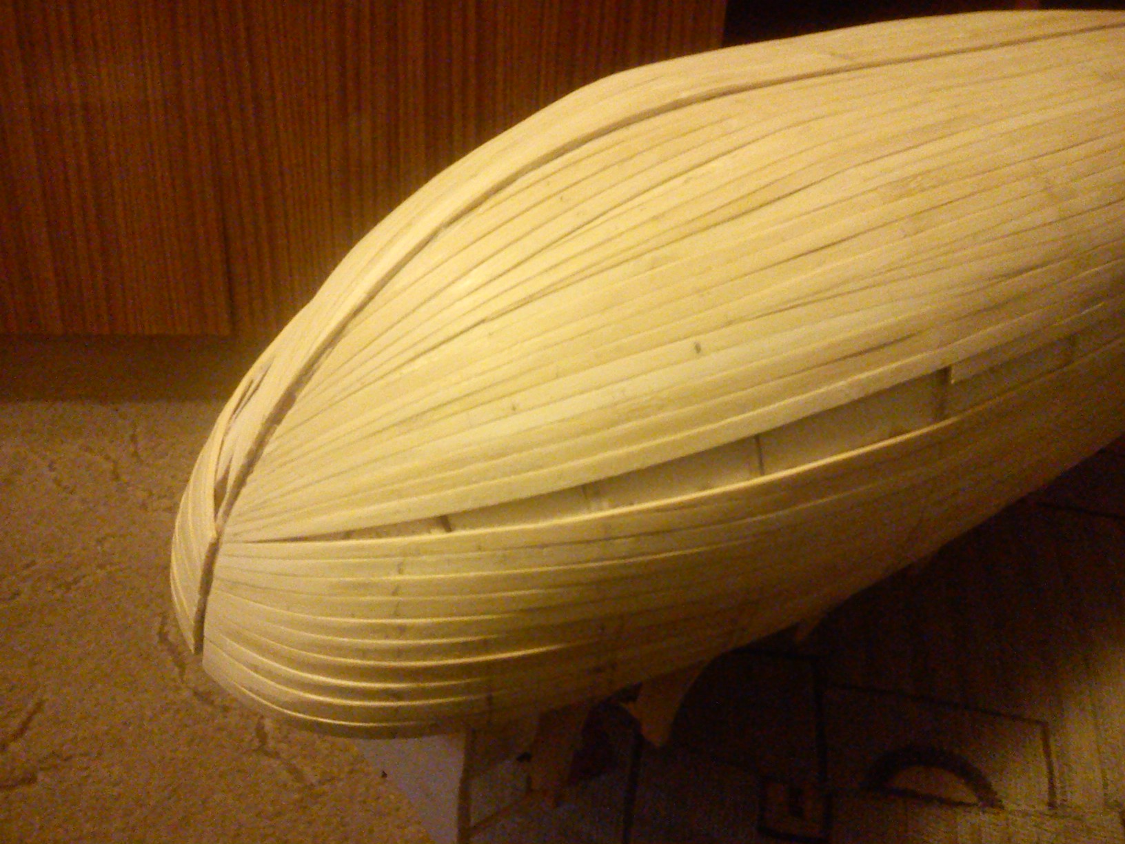 Zakończyłem częściowo prace nad pierwszym poszyciem z bambusa do wysokości środkowego pokładu. Skorzystałem z rady kolegi PawelCH rezygnując z kleju cyjanoakrylowego i zastąpiłem go klejem stolarskim D3 expres .