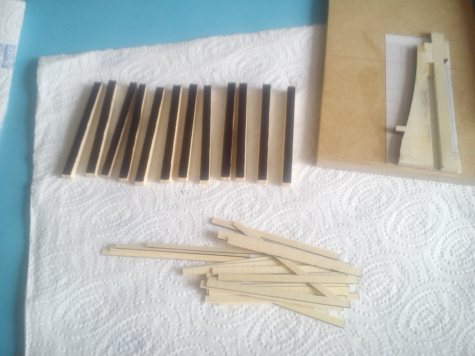Przygotowałem kilka pakietów deseczek na pokład . Krawędz jedną długa i jedna krótką pokrylem klejem a następnie pomalowałem lakierobejcą heban .