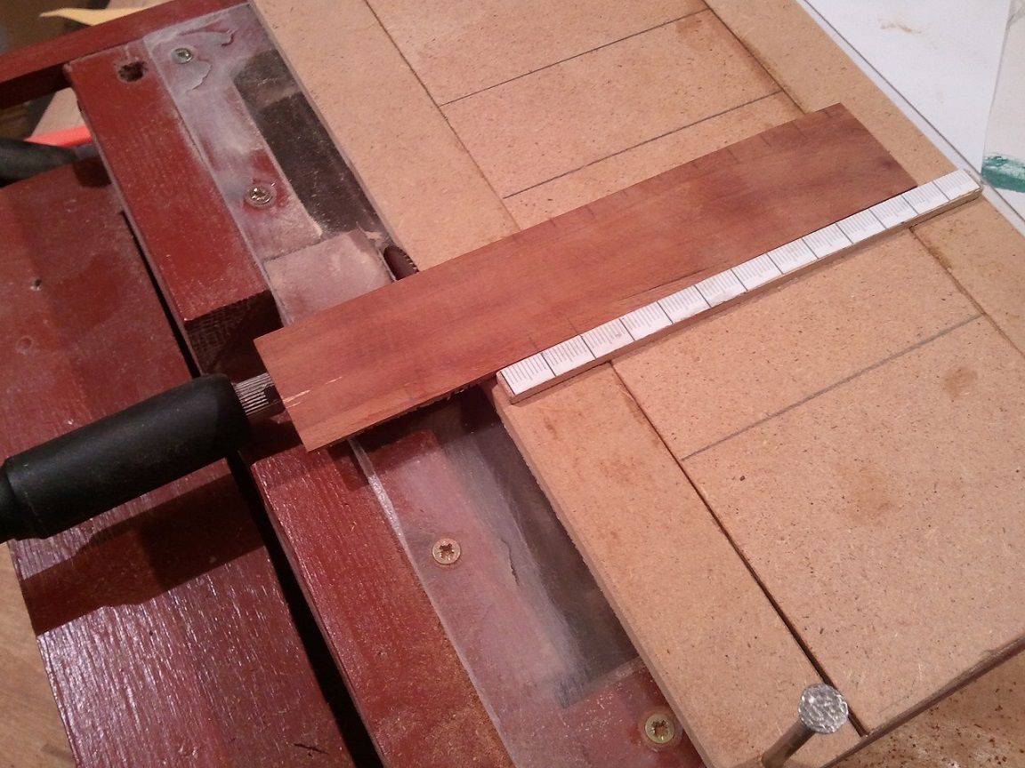 - Na koniec powróciłem do sposobu znalezionego na Kodze. Fornir buk, gr. 0,8mm. Pocięty na paski 1,5mm. Paski zostały przyklejone klejem Patex universal. Tu uwaga: spitoliłem trochę robotę, bo nie wszędzie paski forniru były dostatecznie mocno przyklejone. W efekcie podczas cięcia niektóre kawałeczki odpadały i trzeba je potem było powklejać.