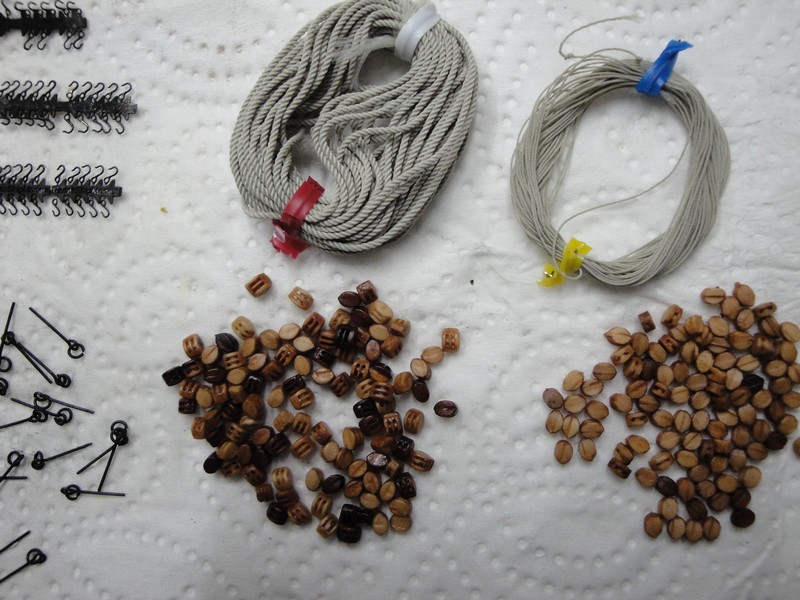Skonczylem strugac patyczki. Reje sa, podobnie jak i maszty, z orzecha o srednicy 8-3mm wyprofilowane na 6-2mm i cale pokryte czarnym tuszem. Mialem dwa rodzaje oczek pod line uchwytowa (?): 1,5mm fototrawione z bachy mosieznej o grubosci 0,4mm (Mirek/Radek) i standartowe 1,5mm z drutu miedzianego 0,6mm. Wszystkie oczka poczernilem, jak zwykle, kwasem selenowym.