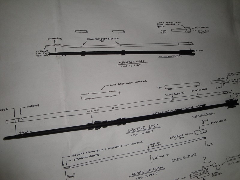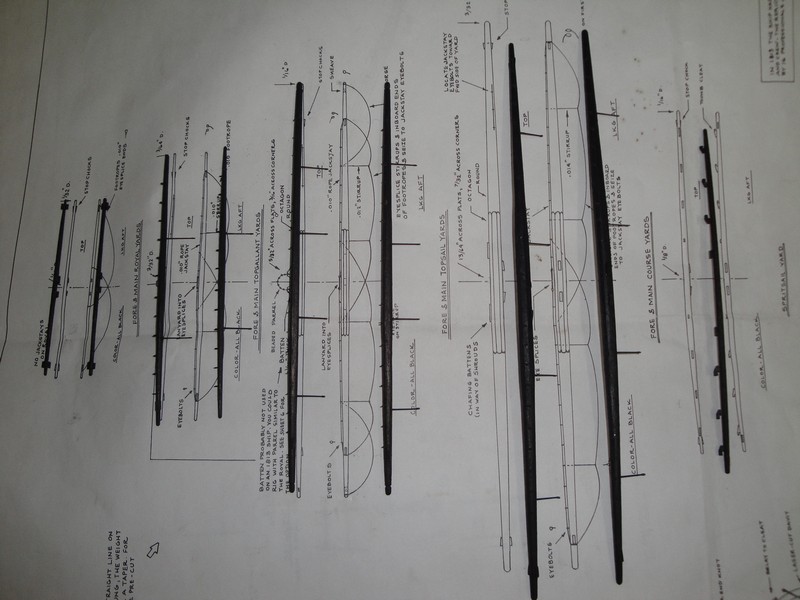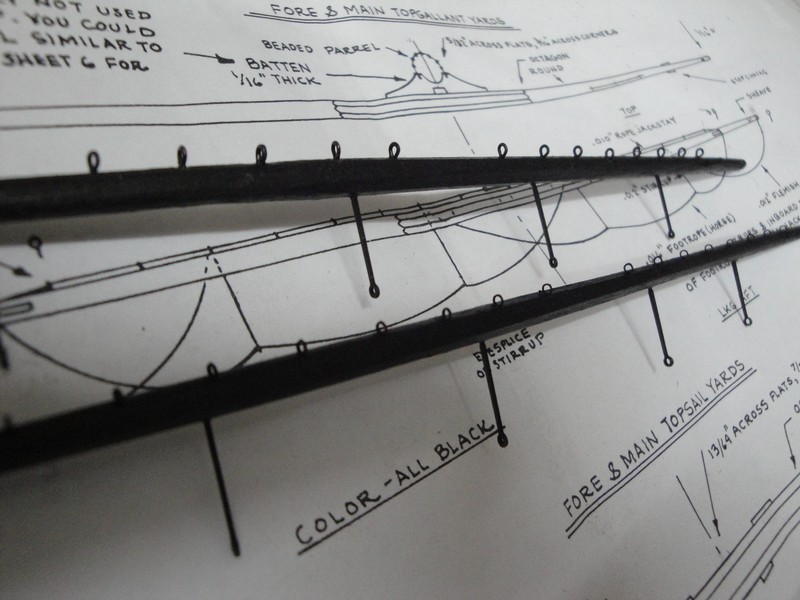 Skonczylem strugac patyczki. Reje sa, podobnie jak i maszty, z orzecha o srednicy 8-3mm wyprofilowane na 6-2mm i cale pokryte czarnym tuszem. Mialem dwa rodzaje oczek pod line uchwytowa (?): 1,5mm fototrawione z bachy mosieznej o grubosci 0,4mm (Mirek/Radek) i standartowe 1,5mm z drutu miedzianego 0,6mm. Wszystkie oczka poczernilem, jak zwykle, kwasem selenowym..
