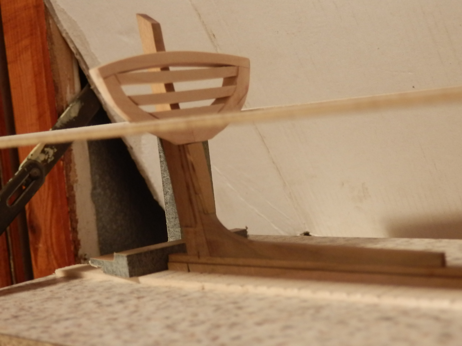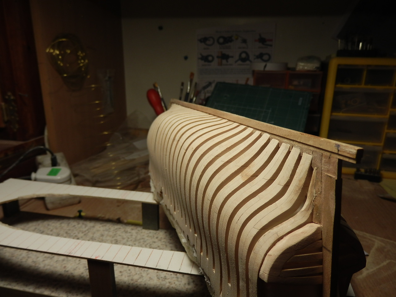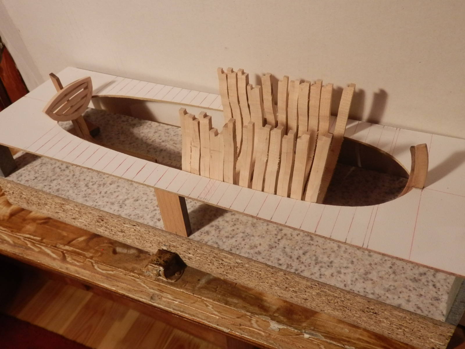 Zrobiłem już stocznie i powoli zaczynam wycinać wręgi, w ich budowie pozwolę sobie na pewne uproszczenia,zależy mi głównie na oddaniu ich kształtu i nauce ich robienia.