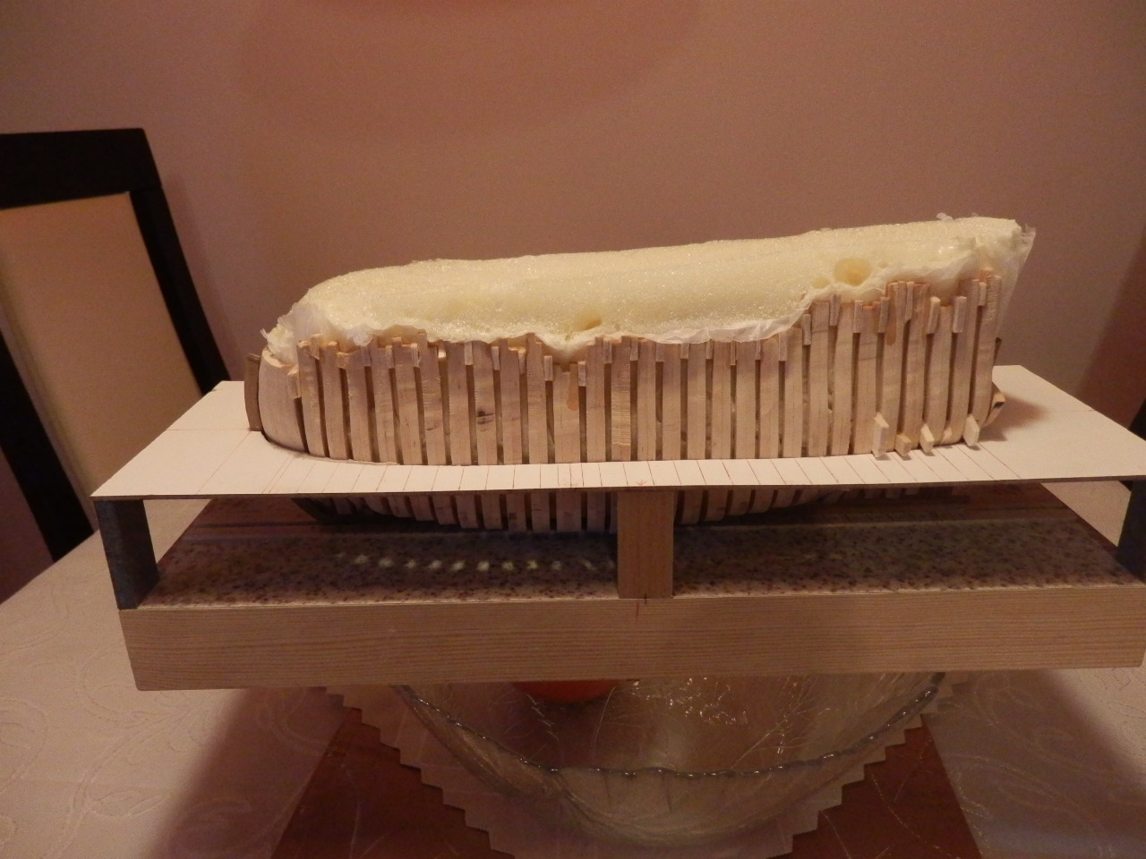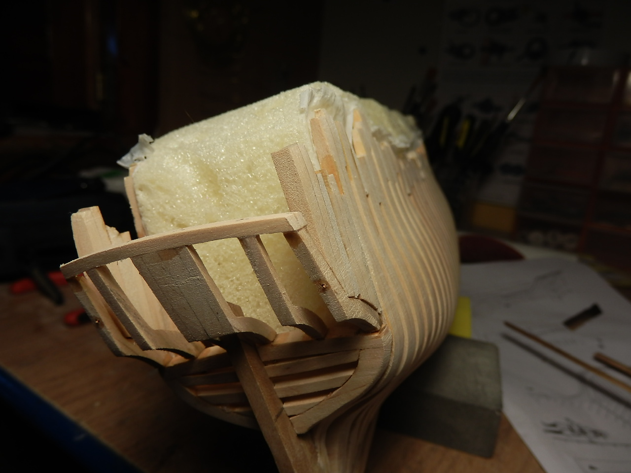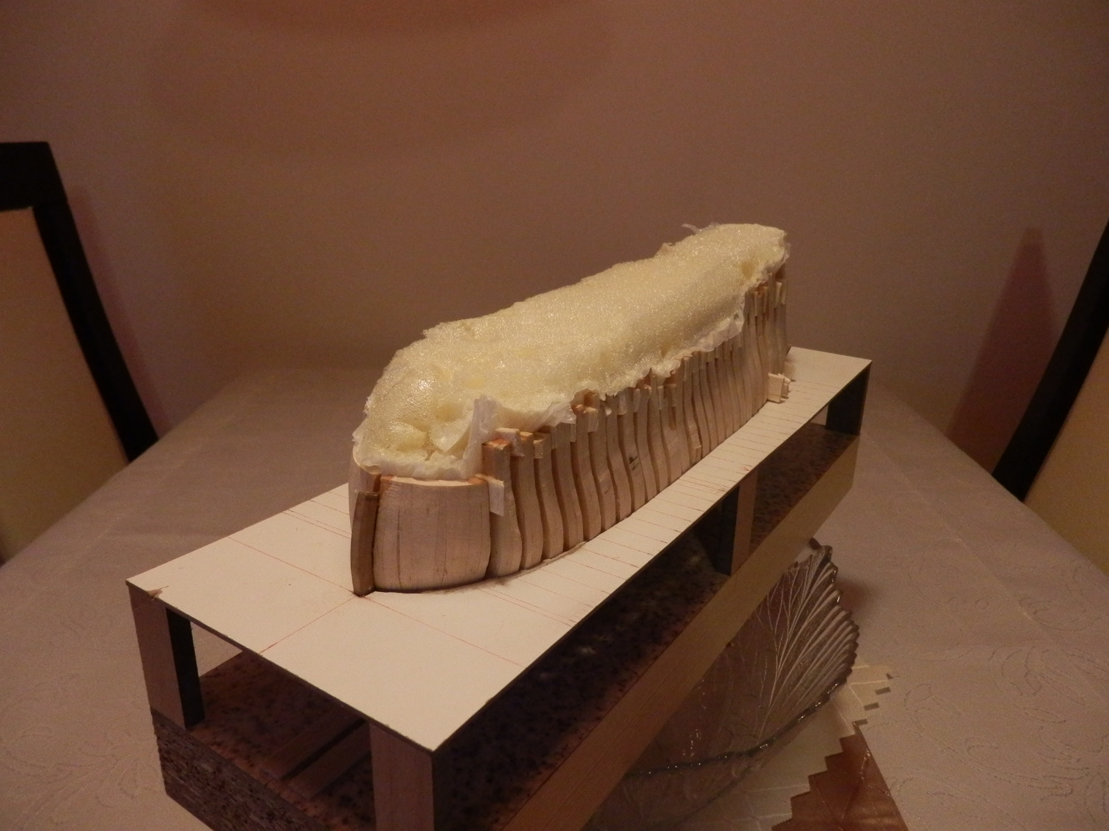 Skorupa wytrasowana, wyszła lepiej niż się spodziewałem teraz kolejny krok do zrobienia czyli dobudowanie rufy i dokończenie trasowania a następie wygładzenie całości drobnoziarnistym papierem ściernym.