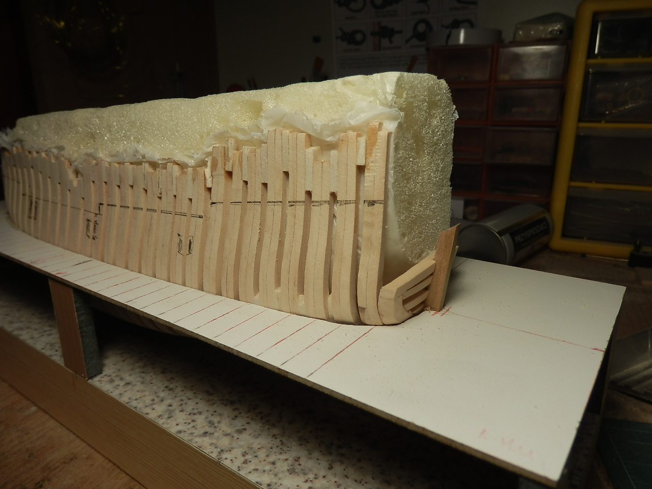 Pozwoliłem sobie też wstępnie wyrysować wysokość wręg celem sprawdzenia jaka ich część pójdzie do odcięcia.Widać to na jednym ze zdjęć.