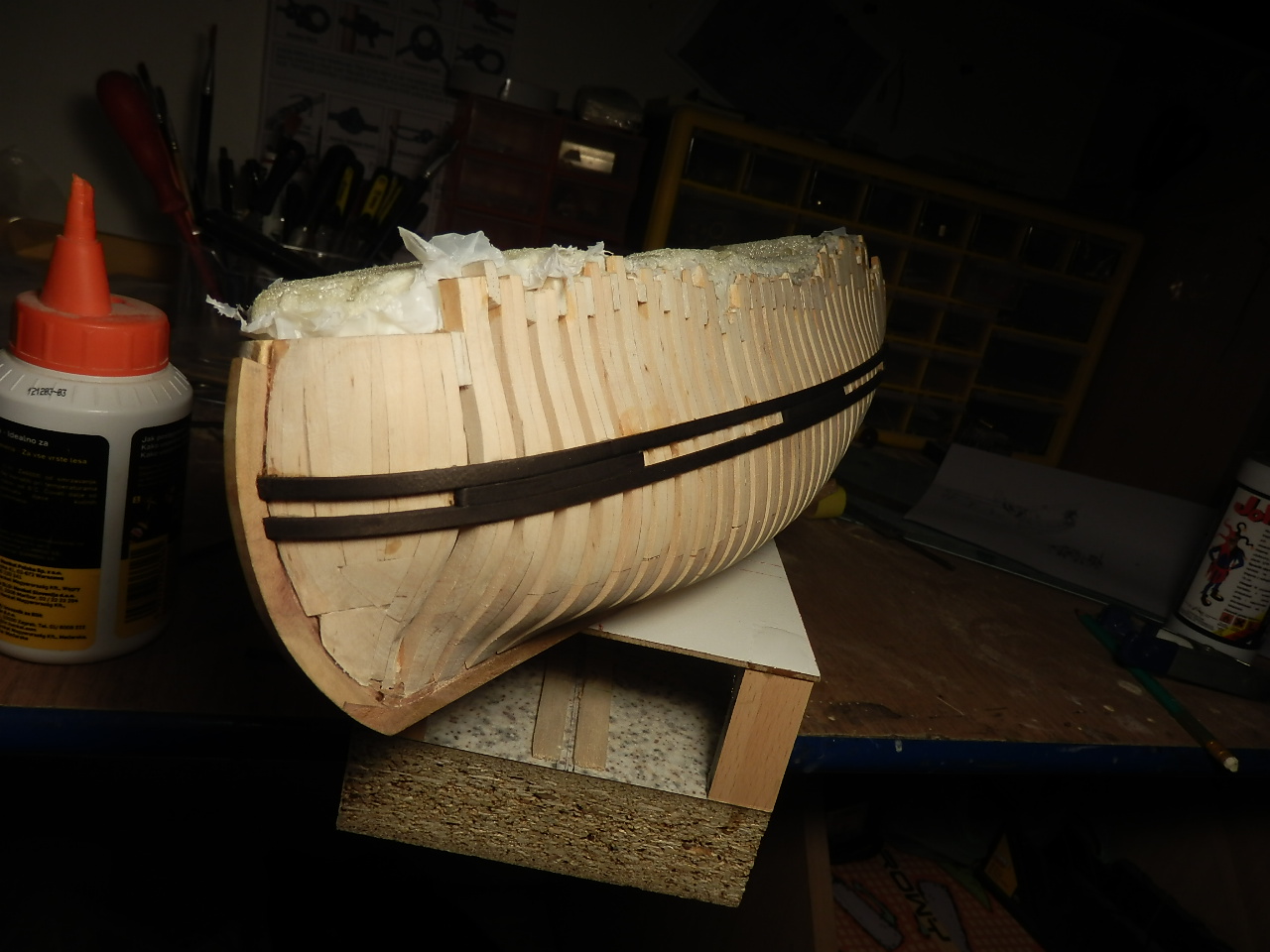 Doszła rufa, w pewnym momencie chciałem to wszystko rozwalić i robić od nowa (tak może było by i lepiej) jednak jakoś się udało to poskładać do kupy i po szlifowaniu jest do przyjęcia. Są oczywiście drobne niedoskonałości jednak zostaną zakryte przez odbojnice a część którą będę chciał pozostawić odsłoniętą jest ok.Na jednym ze zdjęć widać wyginające się już listewki
